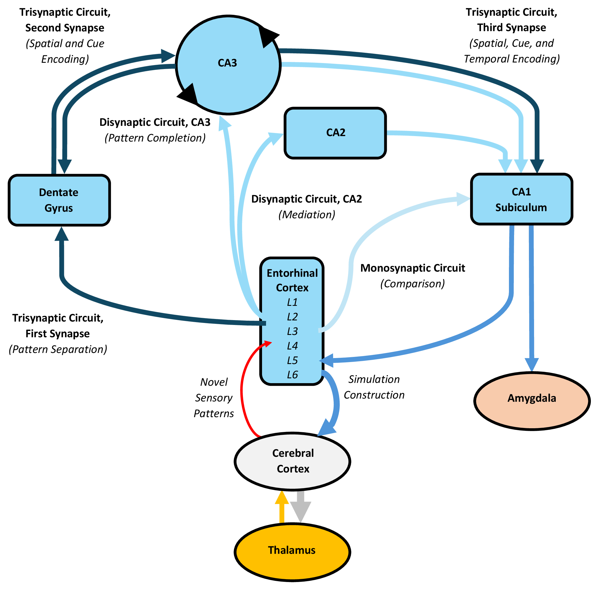 The hippocampal complex likely engages in an alternative form of predictive processing by capturing novelty and constructing episodic simulations, which represent highly abstract or hypothetical predictions that contribute to the conscious cognitive experience. Its processing relies on distinct subdivisions that engage in the classic “trisynaptic” cortico-hippocampal-cortical circuit, as well as lesser-known “disynaptic” and “monosynaptic” circuits (Fig. 4).