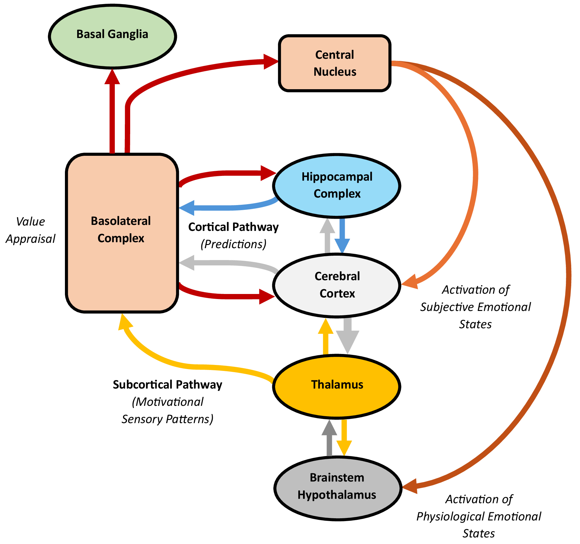 Though its precise role in emotion is still debated, the amygdala influences predictive processing by appraising motivational value and activating emotional states, which predict survival-critical events and prime the brain for action, contributing to a subjective emotional experience. Amygdala processing depends on distinct nuclei involved in “subcortical” and “cortical” pathways (Fig. 5).