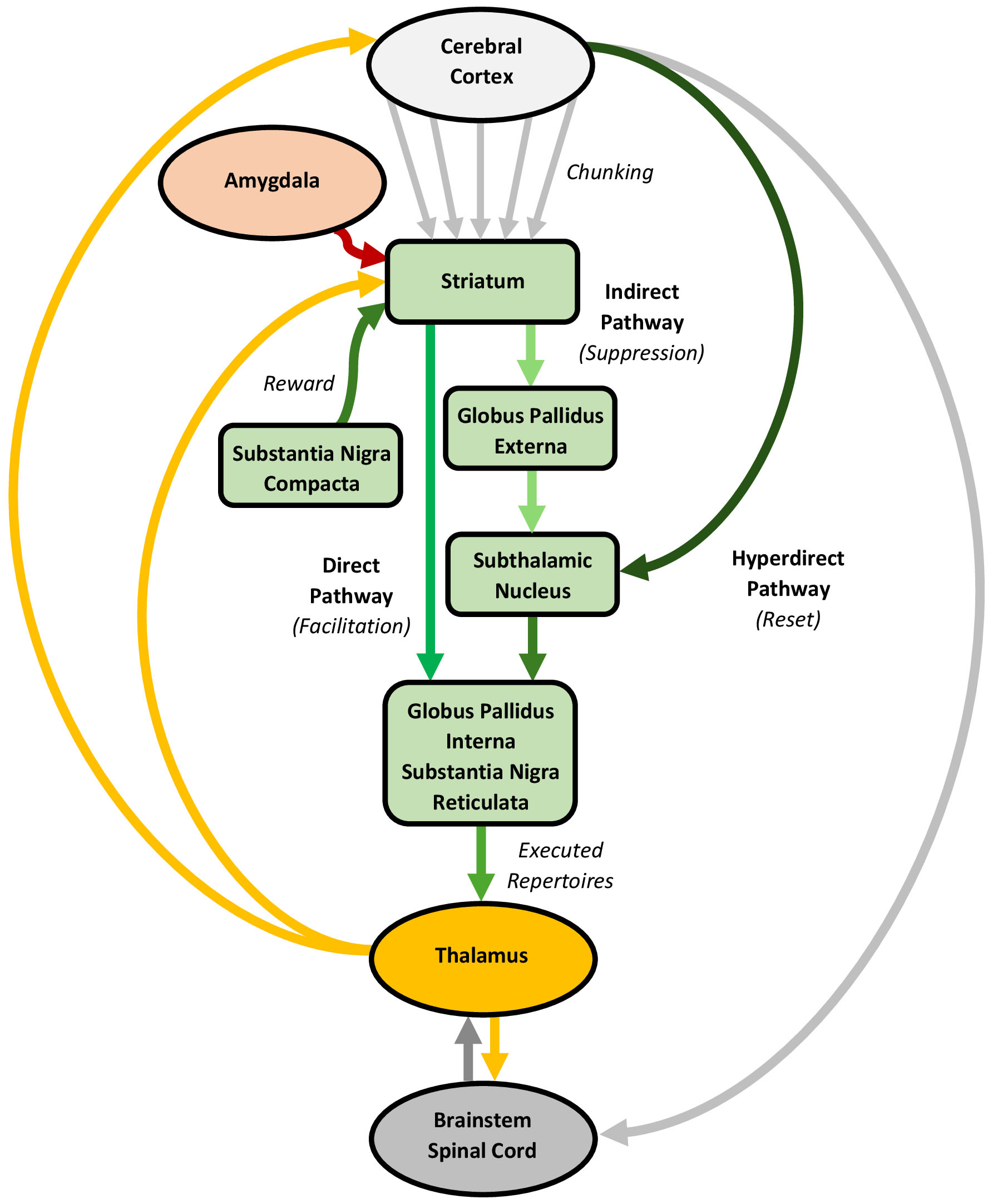 Fig. 6. Processing in the basal ganglia, with an emphasis on the direct, indirect, and hyperdirect pathways. The cerebral cortex, basal ganglia, thalamus, and amygdala are connected through circuits involving direct, indirect, and hyperdirect pathways. These circuits likely learn purposeful and habitual actions through a striatal chunking process, which integrates and converts action signals, including proprioceptive predictions, into cohesive repertoires. Chunking allows complex actions to be stored as single units, facilitating their cohesive expression with minimal conscious oversight. The selective execution of these action (and potentially, experience) repertoires involves a co-mobilization of the direct and indirect pathways, regulated by a dopamine reward signal. The direct pathway facilitates the execution of specific action repertoires, whereas the indirect pathway suppresses irrelevant actions. The hyperdirect pathway likely serves as a global reset, halting ongoing actions to enable repertoire switching. The figure was created using Microsoft Word 365.