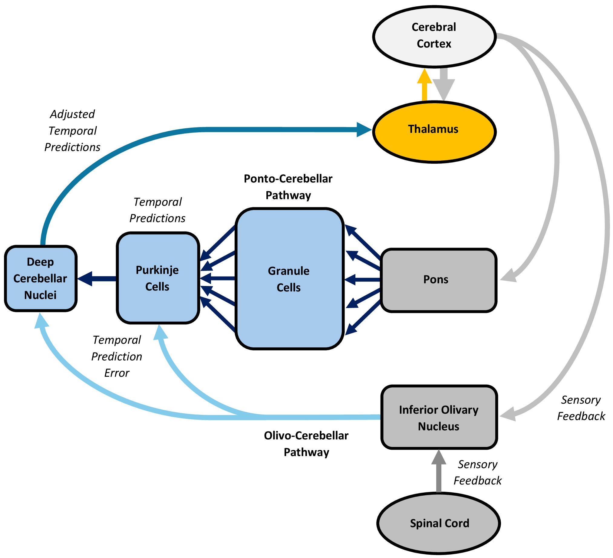 By engaging in its own unique form of predictive processing, the cerebellum likely sculpts cortical predictive processing by generating and adjusting temporal predictions, enabling the coordinated expression of actions and supporting perceptual, cognitive, and emotional experiences. Cerebellar processing depends on cortico-brainstem-cerebellar-thalamic circuits, involving “ponto-cerebellar” and “olivo-cerebellar” pathways (Fig. 7).
