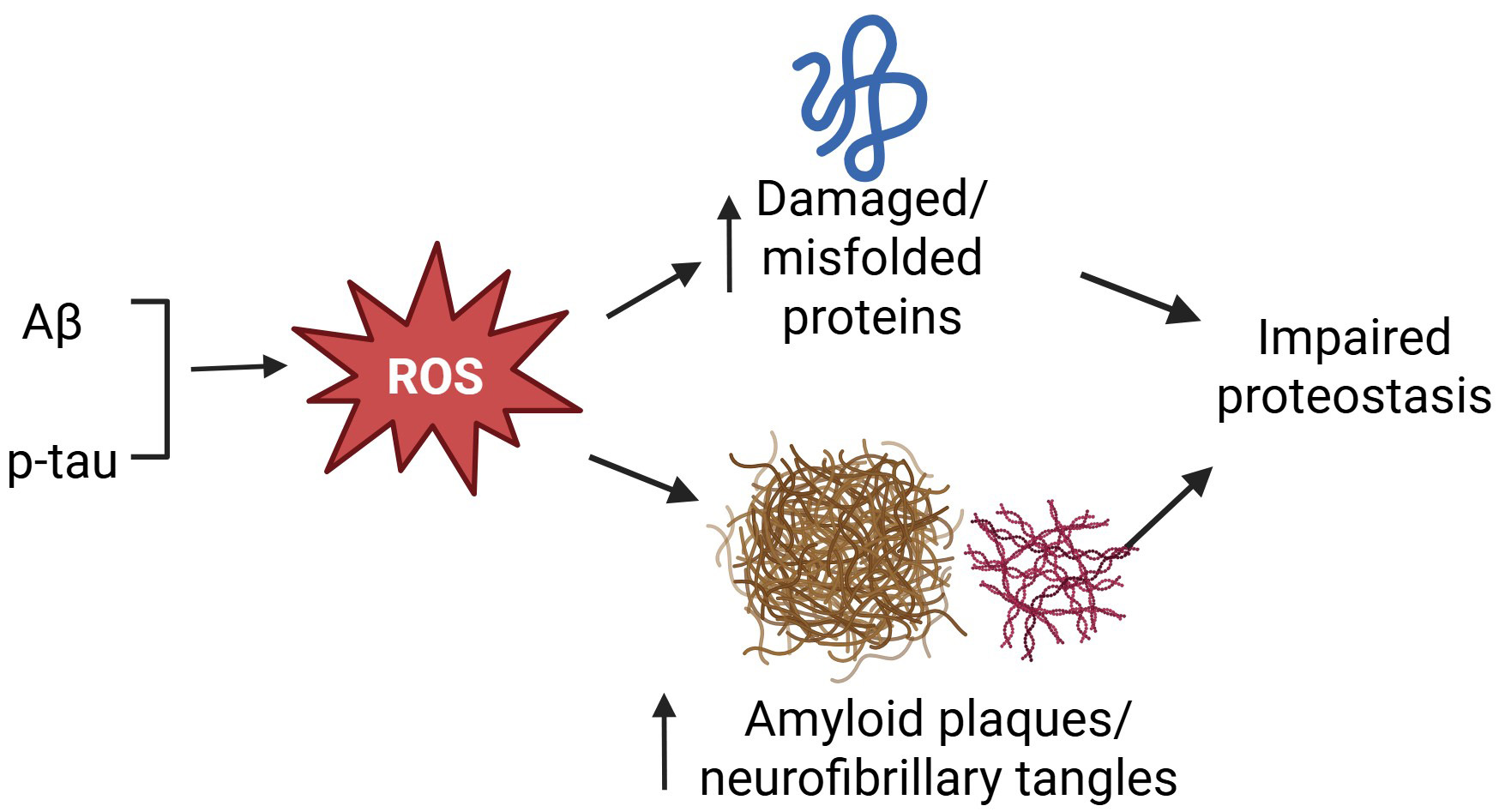 Fig. 1. Oxidative stress impairs proteostasis in AD. Increased production of amyloid peptides and phosphorylated tau (p-tau) enhances the generation of ROS to damage intracellular proteins and increase the accumulation of amyloid plaques and neurofibrillary tangles, leading to impaired proteostasis. AD, Alzheimer’s disease; ROS, reactive oxygen species; Aβ, amyloid β protein.