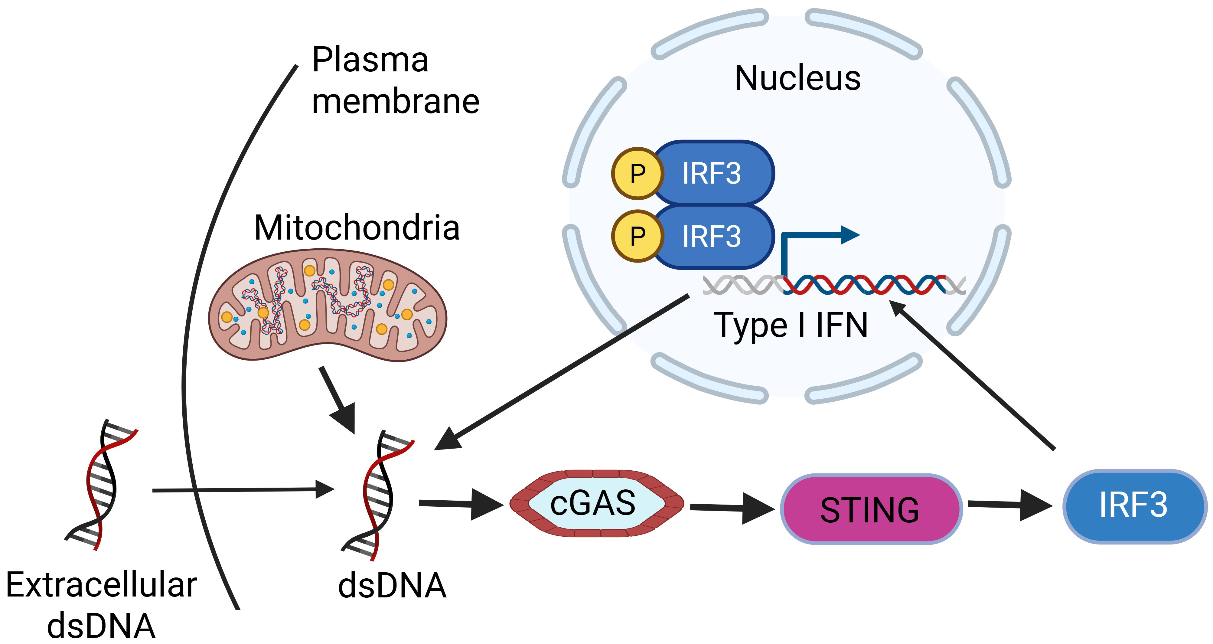 Fig. 2. dsDNA activates cGAS-STING signaling pathway to transcribe type I IFNs and trigger inflammation. Created with https://www.biorender.com/. dsDNA, double stranded DNA; IFNs, interferons; IRF3, interferon regulatory factor 3; cGAS, cyclic GMP-AMP synthase; STING, stimulator of interferon genes.