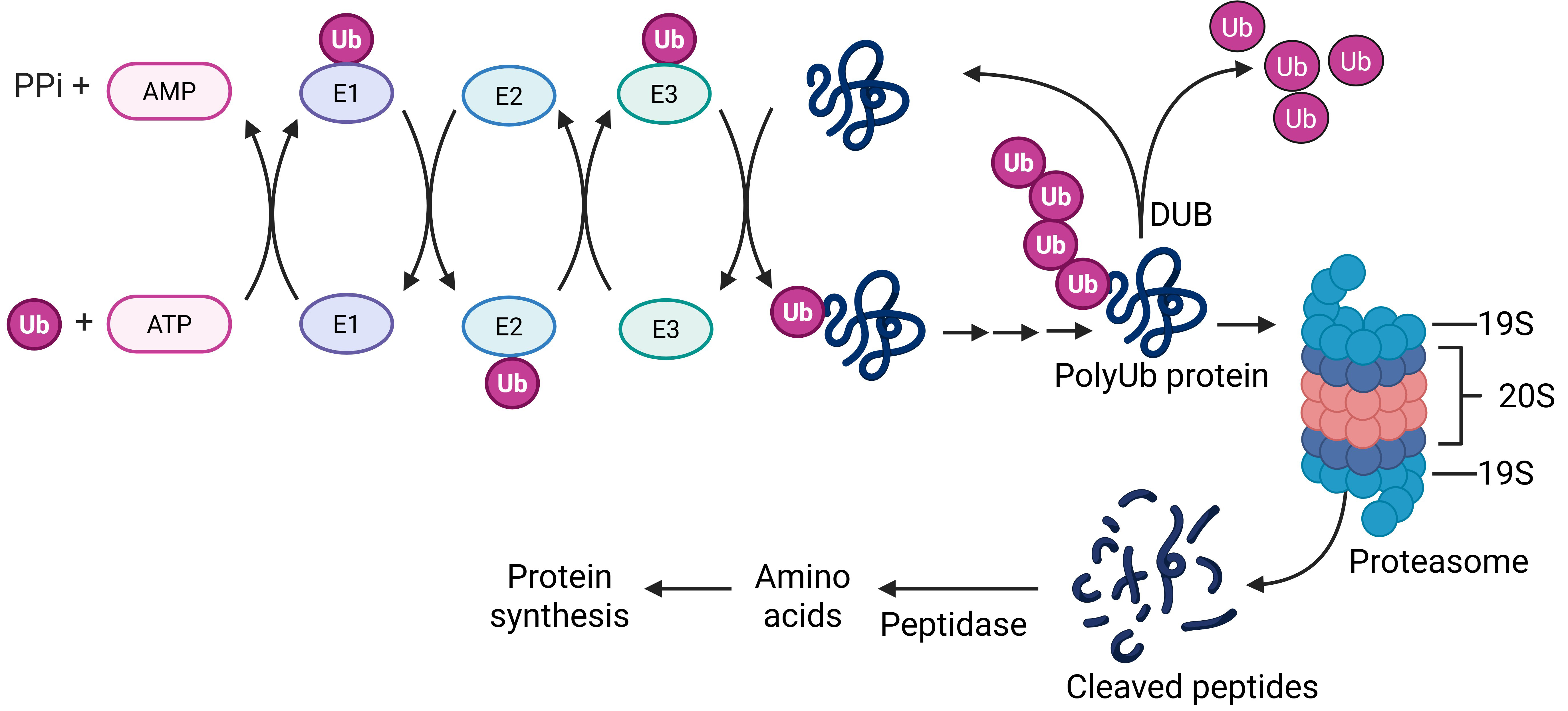 Fig. 3. UPS pathway. In the presence of ATP and the three ubiquitin enzymes (E1, E2, and E3), a Ub is covalently added to a substrate protein. Repeat ubiquitination leads to a polyUb chain attached to the protein to mediate the substrate protein interacting with the proteasome for degradation. A DUB reverses the ubiqutination process to stabilize the substrate protein. Created with https://www.biorender.com/. UPS, ubiquitin proteasome system; Ub, ubiquitin; DUB, deubiquitinating enzymes.