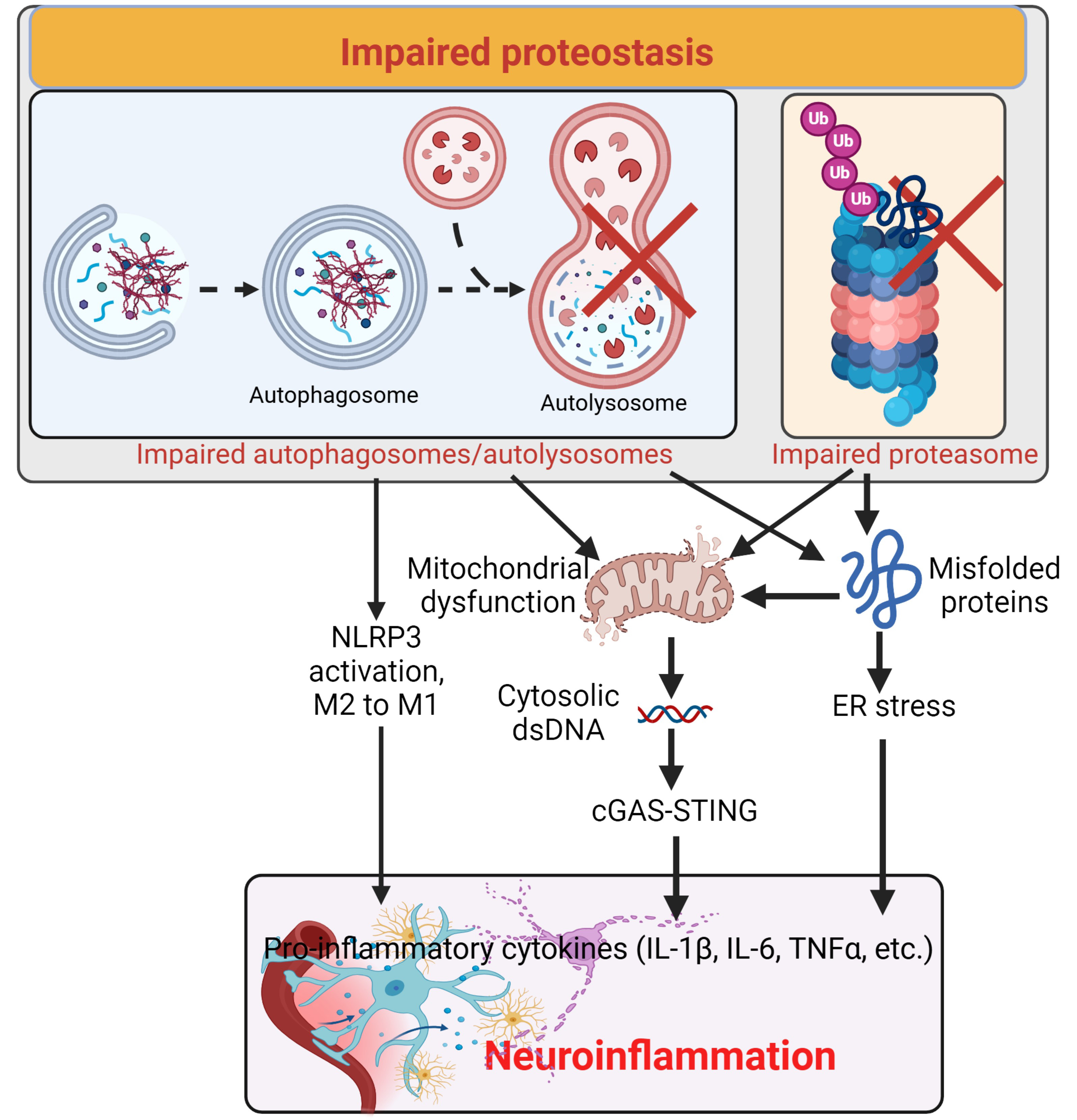 Fig. 4. Impaired proteostasis induces neuroinflammation. Impaired proteasome and autophagy cause accumulation of misfolded proteins and mitochondrial dysfunction, leading to ER stress and release of dsDNA from the mitochondria and/or nuclei to activate the cGAS-STING pathway inducing neuroinflammation. Additionally, impaired autophagy also activates the NLRP3 and facilitates the conversion from M2 to M1 of microglia, enhancing neuroinflammation. Created with https://www.biorender.com/. ER, endoplasmic reticulum; NLRP3, nucleotide-binding oligomerization domain leucine-rich repeat and pyrin domain containing 3; ×,impairment.