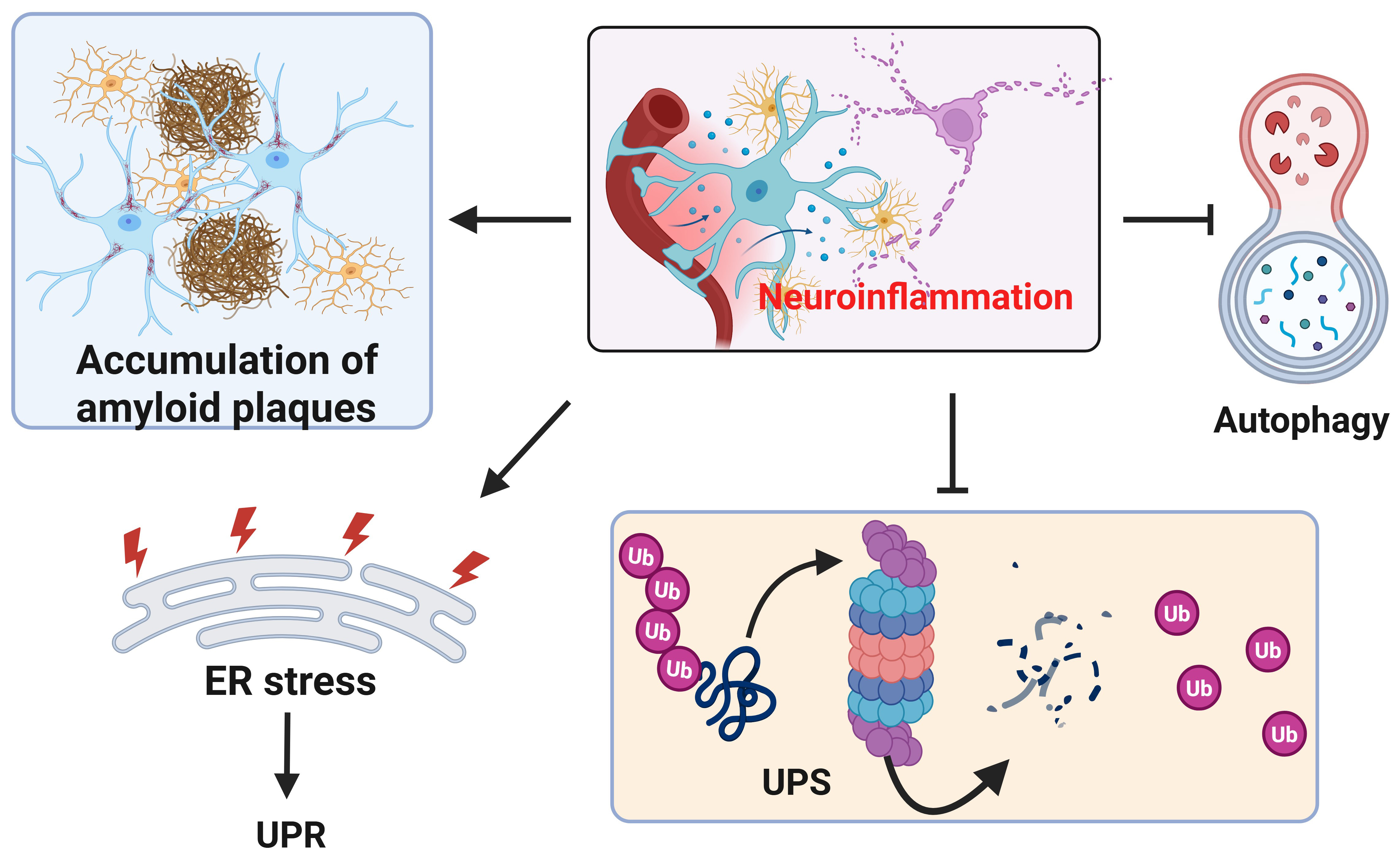 Fig. 5. Neuroinflammation impairs proteostasis. In presence of neuroinflammation, the accumulation of amyloid plaques and p-tau (not shown) increases (upper left). In addition to inducing ER stress and unfolded protein response (UPR) in the ER, neuroinflammation also inhibits UPS and autophagy. Created with https://www.biorender.com/.