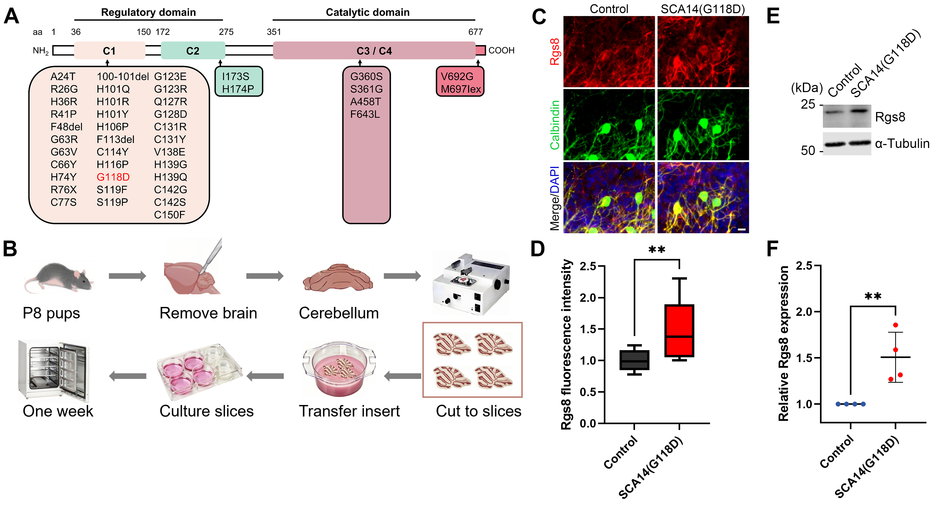 Fig. 1. Increased Rgs8 expression in cerebellar slice cultures of SCA14(G118D) mouse line. (A) Mutation overview in protein kinase C gamma (PKC