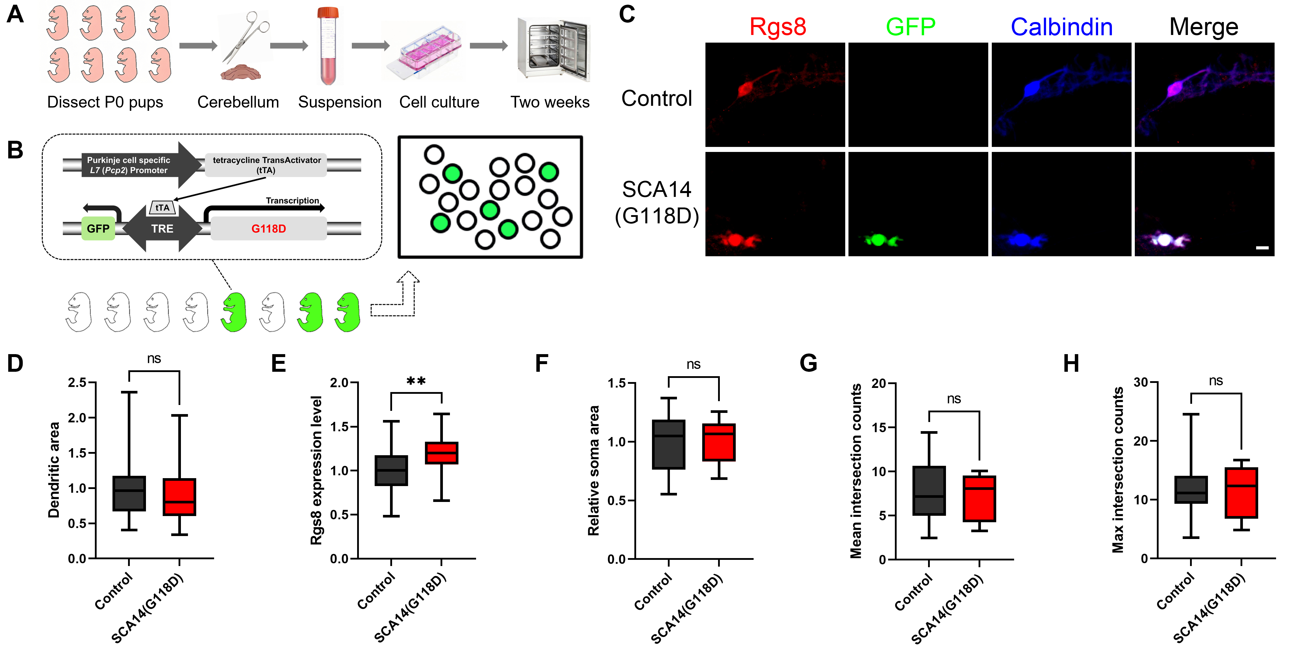 Fig. 2. Increased Rgs8 expression in Purkinje cells of SCA14(G118D) transgenic mice suggests early disruption of intracellular signaling pathway. (A) The illustrated workflow begins with the dissection of postnatal day 0 (P0) mouse pups. Cerebellar tissue is isolated and dissociated into a single-cell suspension, which is transferred into a conical tube. The suspension is then cultured in a dish containing the medium. After a two-week incubation period, the cultured cells are fixed and stained. (B) A depiction of the SCA14(G118D) mouse line is shown, illustrating Purkinje cells that either express the G118D mutant (and are thus GFP-positive) or do not express it (and are GFP-negative). This expression is facilitated by the L7 promoter-based Tet-Off system. Cerebellar dissociated cultures were employed, in which Purkinje cells from both transgenic mice and their control littermates were cultured under identical conditions. Within the culture dish, GFP-positive cells (appearing green) were observed, indicating the expression of the PKC