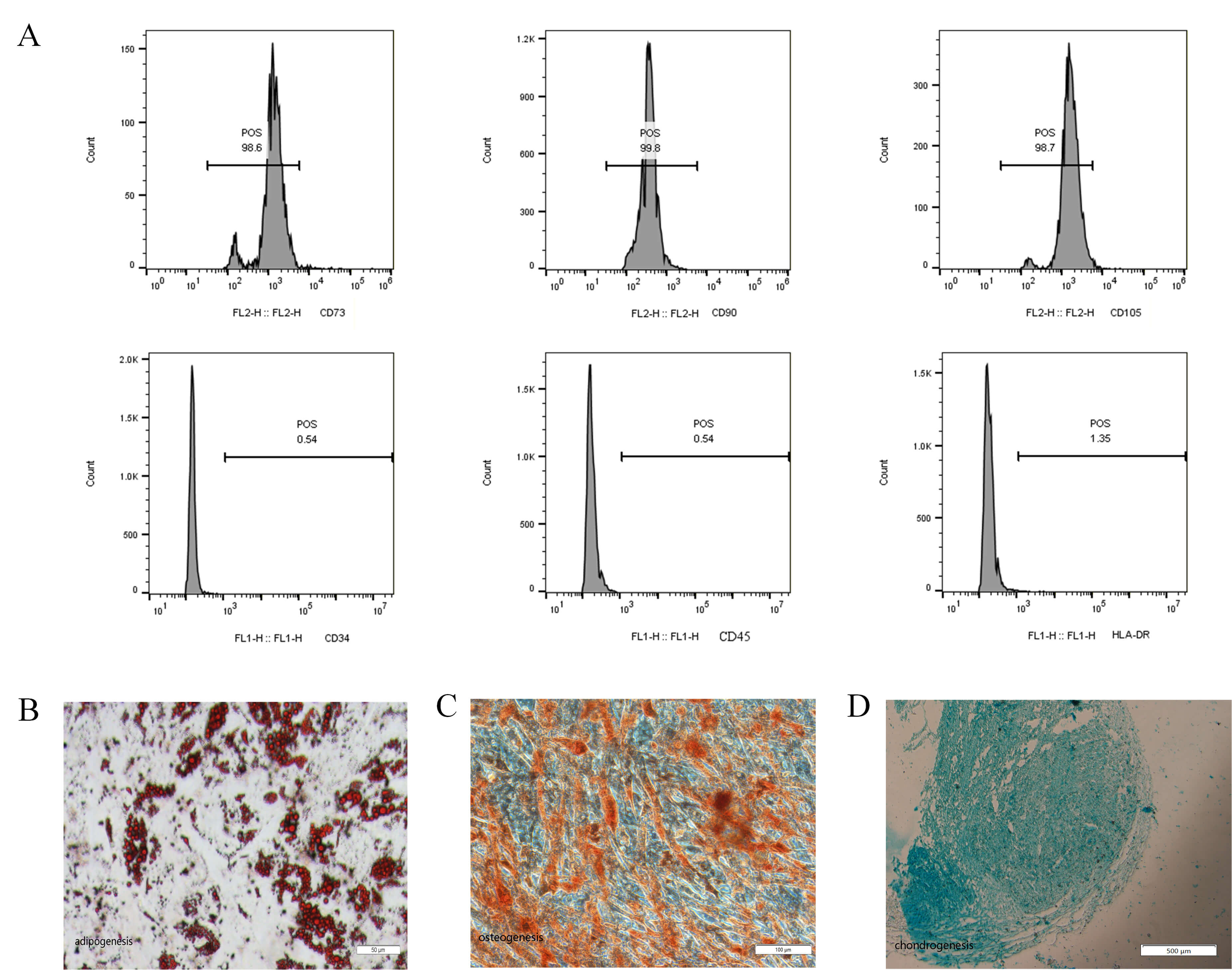 Cell-surface antigens of ADSCs detected by flow cytometry. (A) Representative results of flow cytometry analysis showed that ADSCs expressed CD73, CD90 and CD105. Bottom: in contrast, almost no expression of the hematopoietic lineage markers CD34, CD45 and HLA-DR was detected. (B) After induction of adipogenic differentiation, the cells showed positive staining for Oil Red O. Scale bar = 50 µm. (C) After induction of osteogenic differentiation, the cells showed positive staining for Alizarin red. Scale bar = 100 µm. (D) After induction of chondrogenic differentiation, the cells showed positive staining for Alcian Blue. Scale bar = 500 µm. (n = 3). ADSCs, adipose-derived stem cells; HLA-DR, human leukocyte antigen-DR; CD, cluster of differentiation; FL1-H, fluorescence channel 1- height; FL2-H, fluorescence channel 2- height; POS, positive.