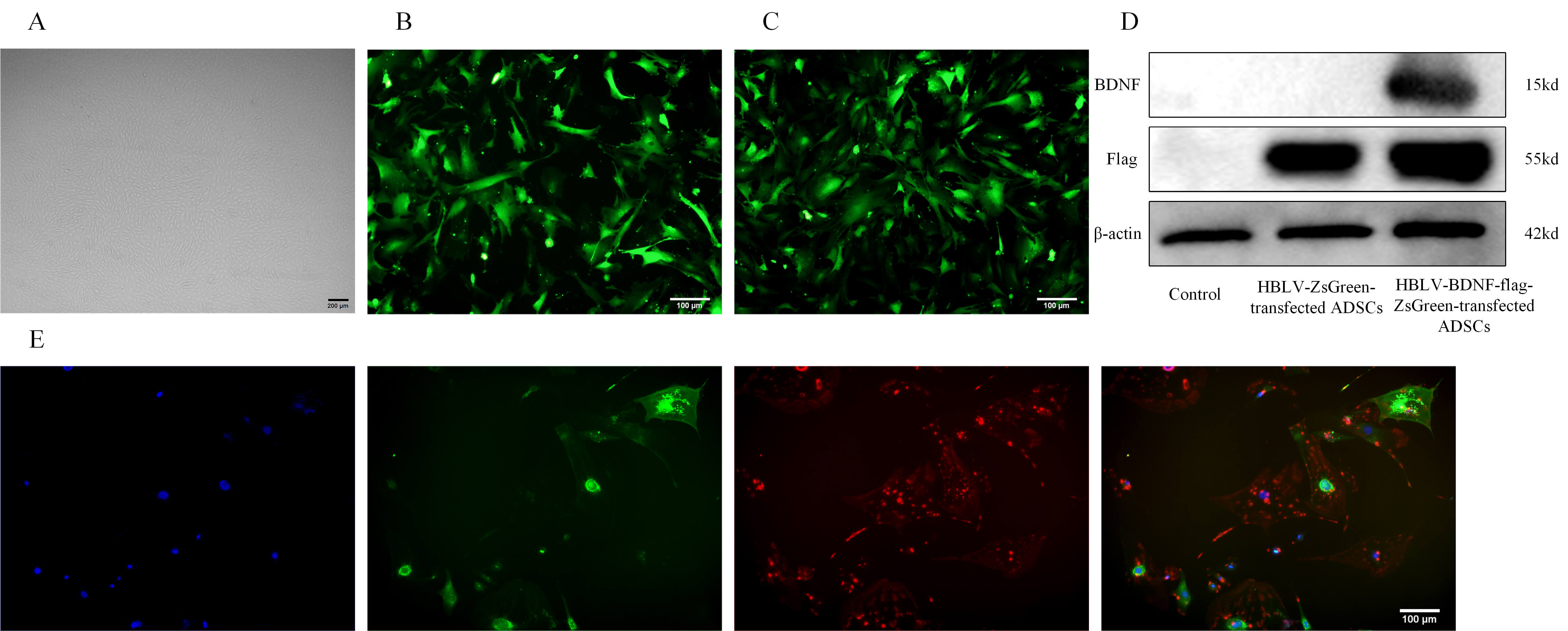 Successful transduction was confirmed by detecting ZsGreen fluorescence in ADSCs under an inverted microscope at 72 h, indicating expression of the respective exogenous genes (human B‑lymphotropic virus [HBLV]-ZsGreen or HBLV-BDNF-flag-ZsGreen). ZsGreen was highly expressed in both cases (Fig. 2A–C). The expression of BDNF protein was confirmed by western blot analysis using total protein extracts from ADSCs transduced with HBLV-BDNF-flag-ZsGreen, with controls including both untransduced cells and HBLV-ZsGreen-transduced cells. The BDNF-flag-ZsGreen fusion protein was specifically detected at its predicted size via anti-flag western blot in the relevant group, confirming successful expression, whereas control groups showed no signal (Fig. 2D). Immunocytochemistry studies verified that BDNF was expressed in HBLV-BDNF-flag-ZsGreen transfected ADSCs (Fig. 2E).