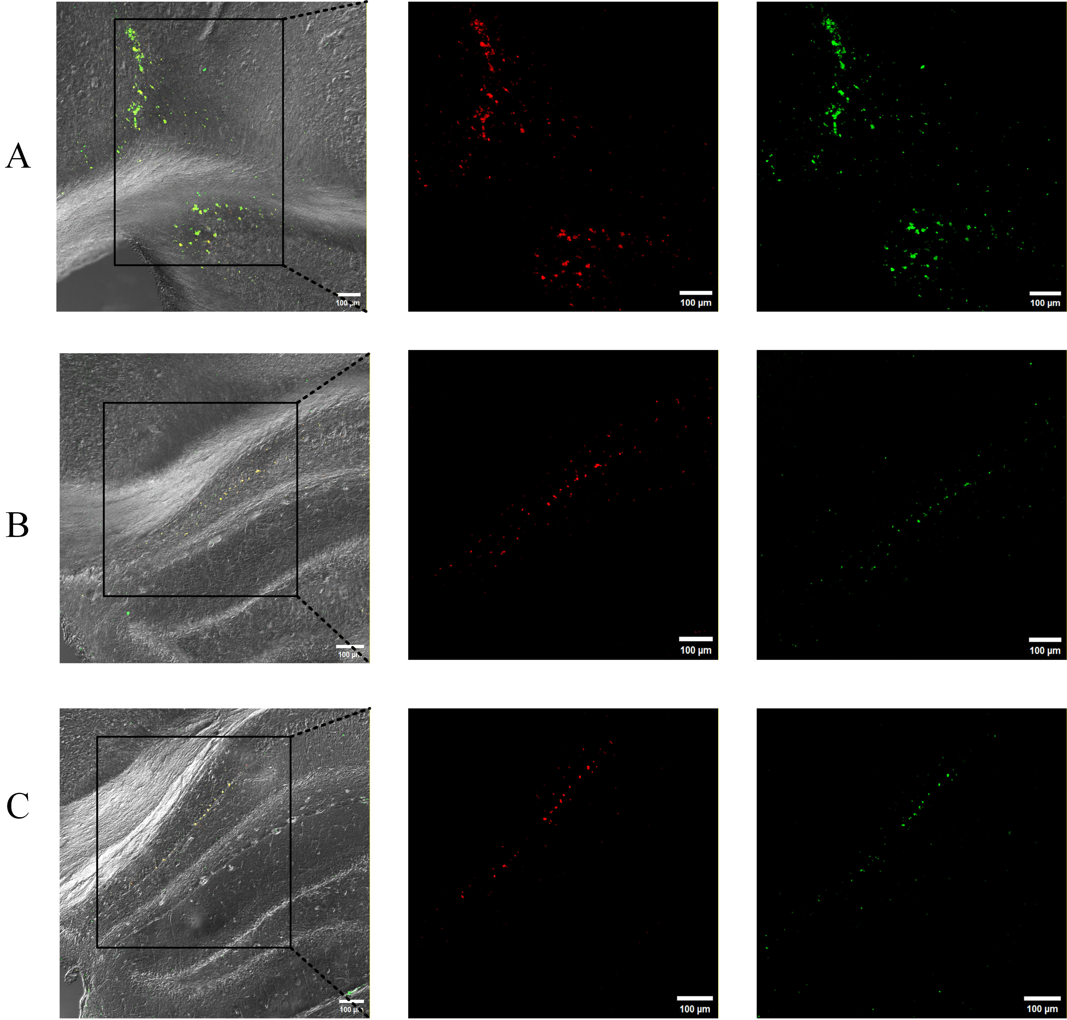Representative distribution of transplanted BDNF-ADSCs in the hippocampus of mice. ZsGreen (Green) was used to label the BDNF-ADSCs, Cy3 (Red) was used to label the Flag expression. Each panel displays, from left to right: low-magnification image with higher power area shown in subsequent panels. On the far right are illustrations of the coronal section at which the image was taken. In (A), labeled cells are present in the retrosplenial cortex as well as in the hippocampus. In (B,C), labeled cells are seen in the medial CA1 pyramidal cell layer. Coronal sections shown are, from bregma: –0.94 mm (A); –1.46 mm (B); –1.70 (C); scale bar = 100 µm; n = 6.