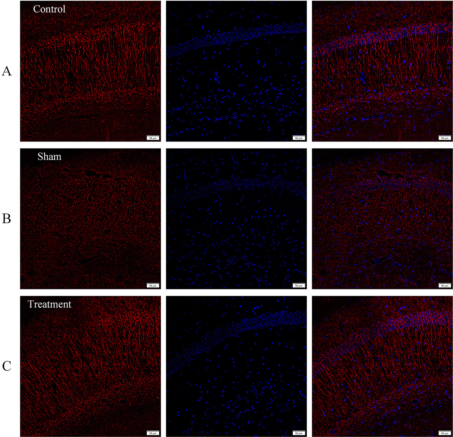 Degradation of dendritic cytoarchitecture is a hallmark of AD, and is reflected in reductions in MAP2 protein levels and patterning in mouse models of the disease [25, 26]. Compared to the control group (Fig. 5A), MAP2 staining in hippocampal area CA1 dendrites in 13-mo-old APP/PS1 mice revealed a shortened dystrophic pattern, indicating that microtubule structure was disrupted (Fig. 5B). In contrast, in mice that had received BDNF-ADSC injections, MAP2-stained dendrites were elongated and more densely distributed, similar to what was seen in control C57/BL6J mice (Fig. 5C).