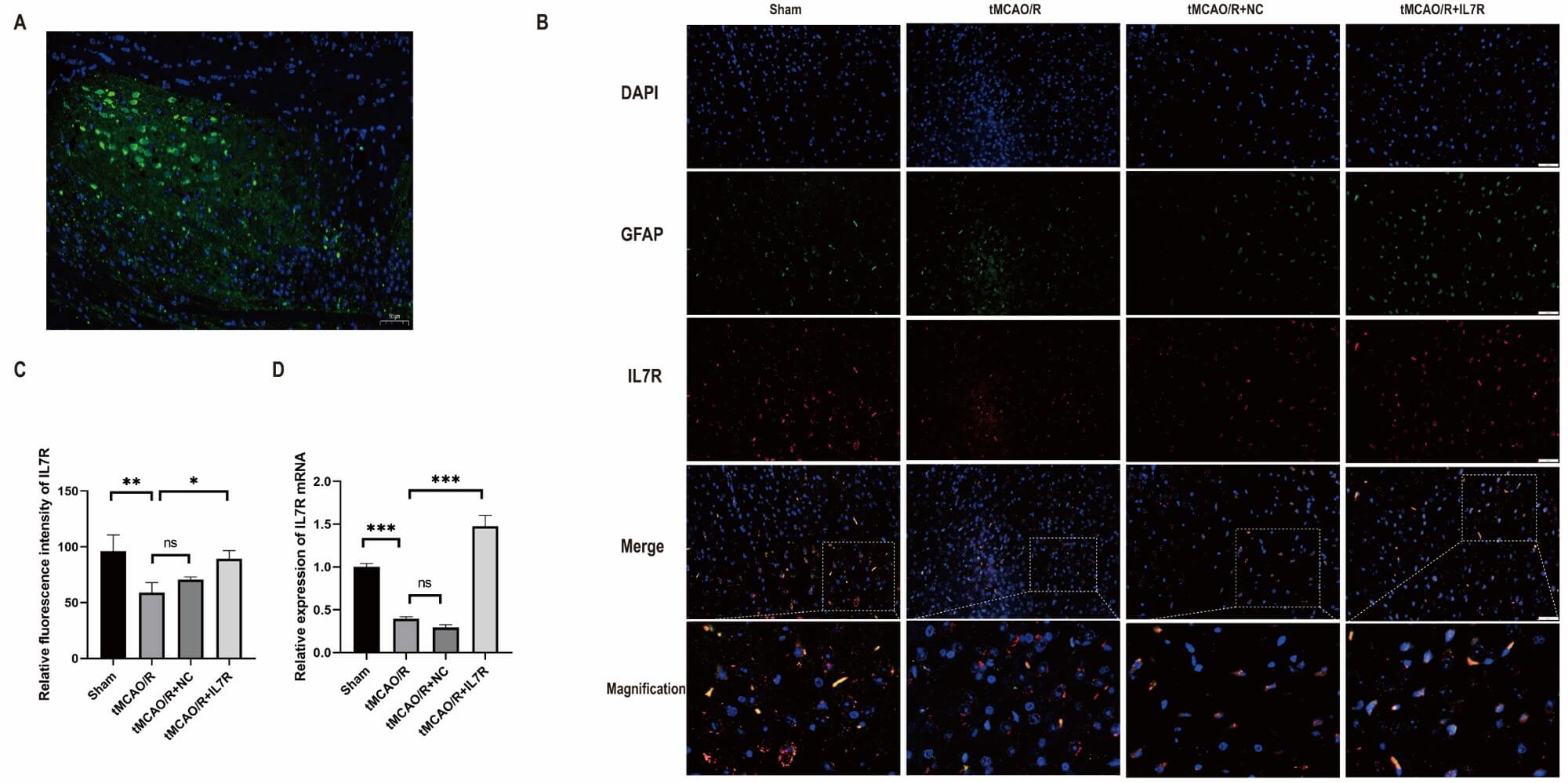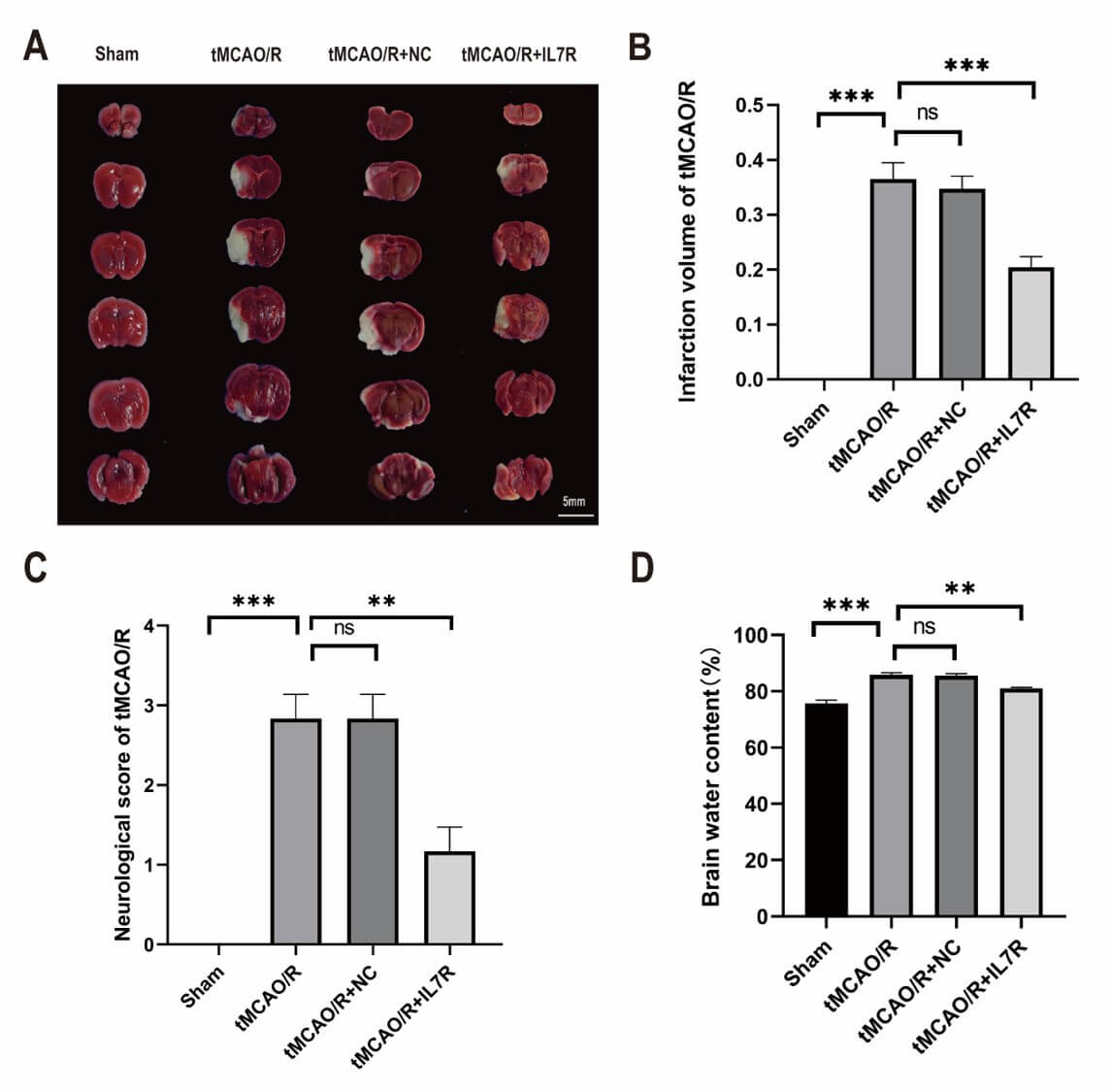 sham, tMCAO/R, tMCAO/R + NC, and tMCAO/R + IL7R groups (n = 3 per