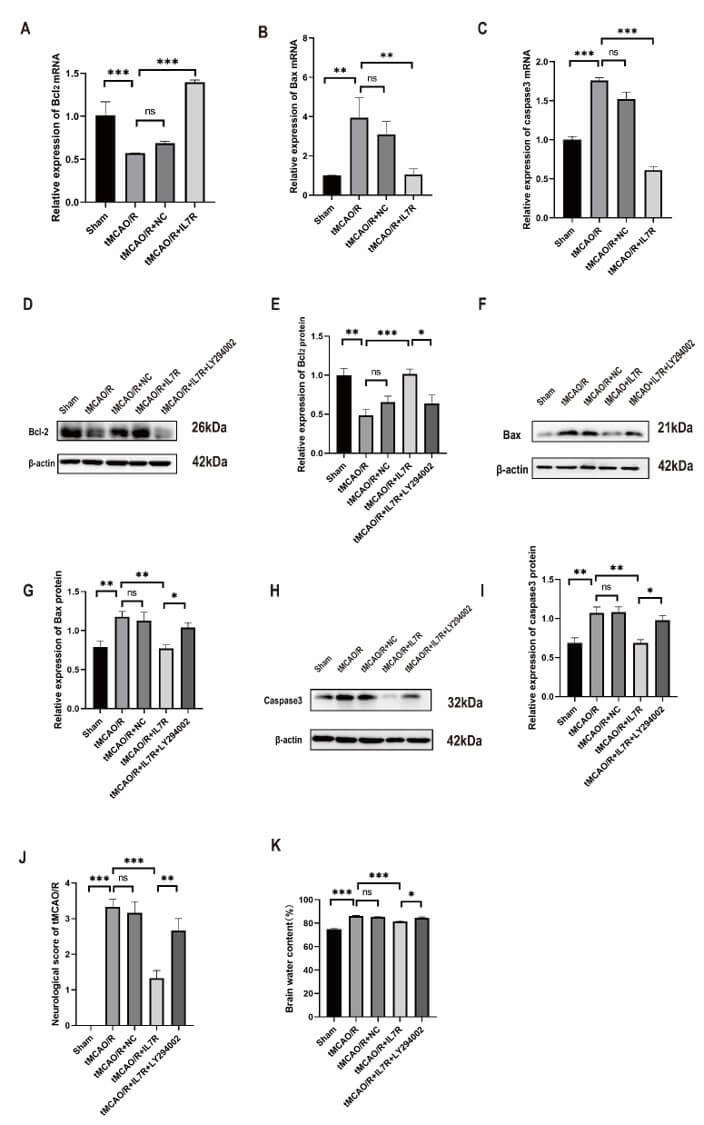 IL7R overexpression significantly attenuated CIRI-induced apoptosis. In vivo, this intervention improved neurological function, alleviated cerebral edema, and decreased infarct volume in tMCAO mice. In vitro, after the overexpression of IL7R, flow cytometry analysis revealed a reduction in apoptosis rates post-OGD/R, whereas transmission electron microscopy revealed fewer morphological alterations associated with apoptosis. In addition, the level of Bcl-2-associated X protein (Bax) and cysteine-dependent aspartate-specific Protease-3 (caspase-3) were decreased, whereas that of B-cell lymphoma-2 (Bcl-2) was increased; these effects were reversed by LY294002.