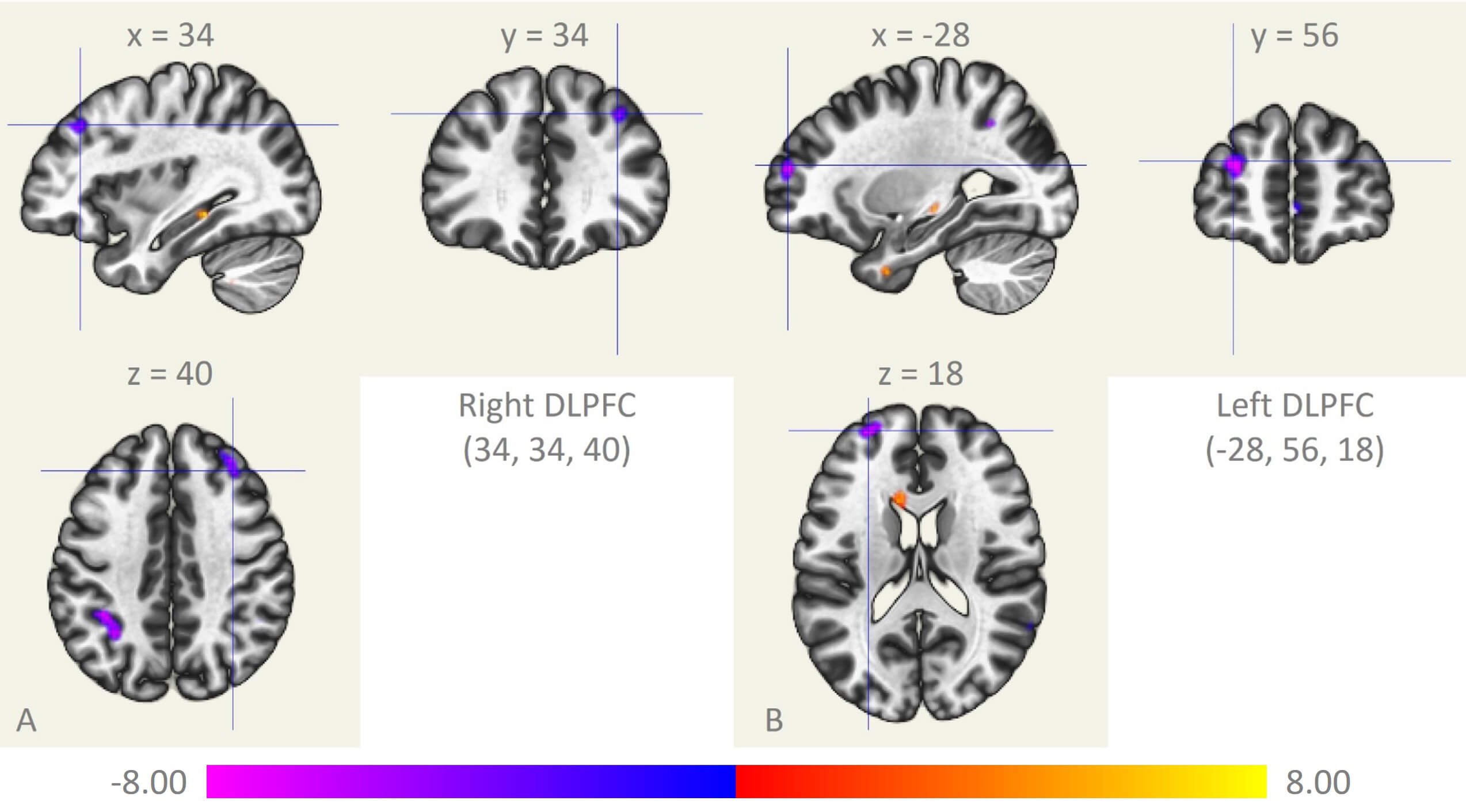 Differences in FC of the DLPFC. (A) Right DLPFC. (B) Left DLPFC. x, y, and z: peak Montreal Neurological Institute coordinates; FC, functional connectivity.
