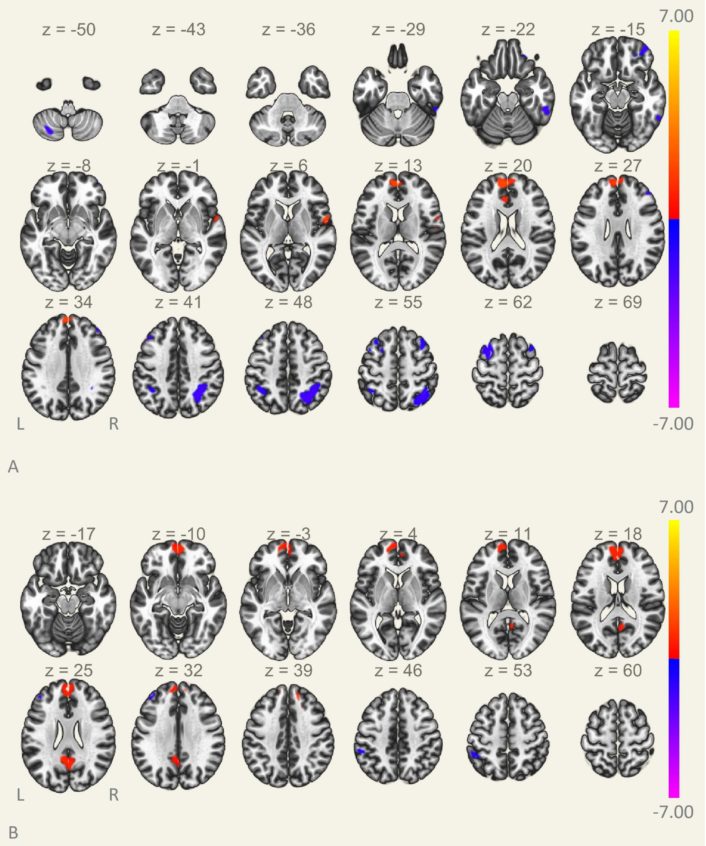 Compared with HC subjects, the right DLPFC in ESRD patients showed decreased FC with the bilateral middle frontal gyrus, right superior frontal gyrus, right superior parietal gyrus, left inferior parietal gyrus, right inferior temporal gyrus, and left posterior cerebellum. In contrast, it showed increased FC with the medial prefrontal cortex, anterior cingulate gyrus, and right rolandic operculum (Table 2, Fig. 2A, k_min = 109 voxels). The left DLPFC showed lower FC with the left middle frontal gyrus and left inferior parietal gyrus, and increased FC with the medial prefrontal and posterior cingulate gyrus (Table 2, Fig. 2B, k_min = 141 voxels).