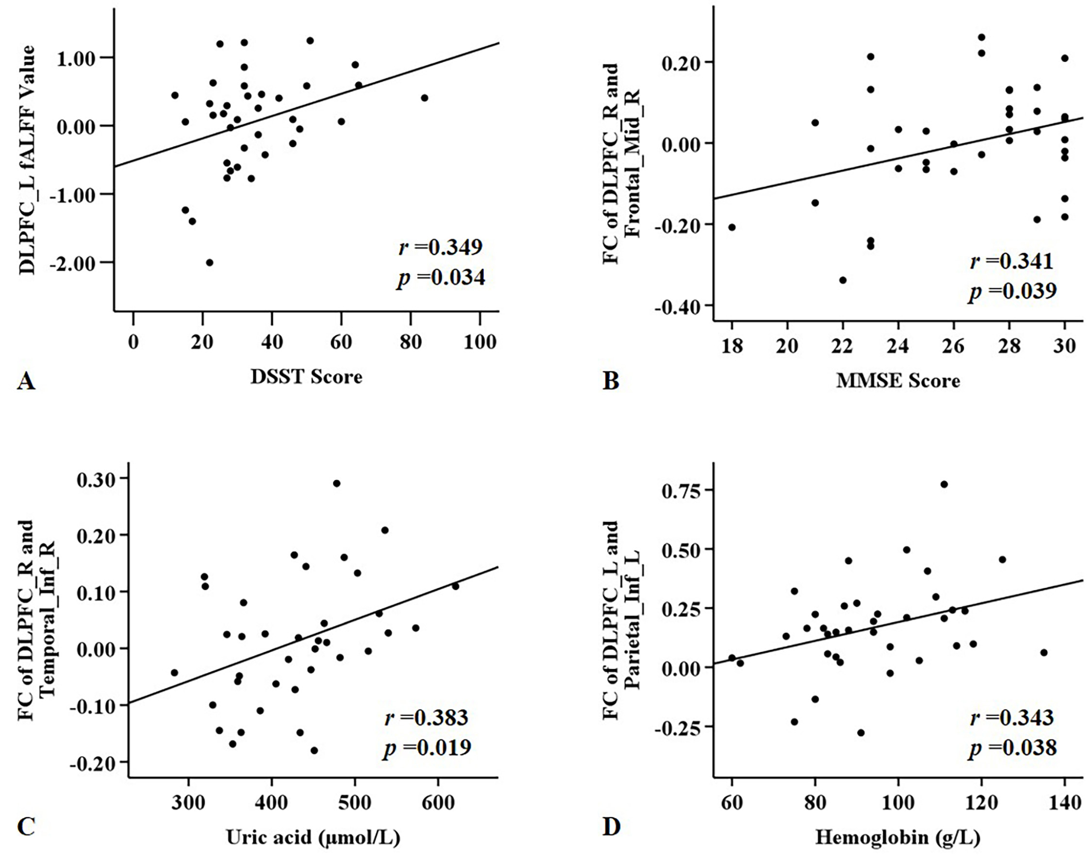 The FC between right DLPFC and right middle frontal gyrus positively correlated with MMSE score (r = 0.341, p = 0.039) (Fig. 3B), while the FC between right DLPFC and right inferior temporal gyrus correlated positively with serum uric acid level (r = 0.383, p = 0.019) (Fig. 3C). The FC between left DLPFC and left inferior parietal gyrus was positively correlated with hemoglobin level (r = 0.343, p = 0.038) (Fig. 3D).