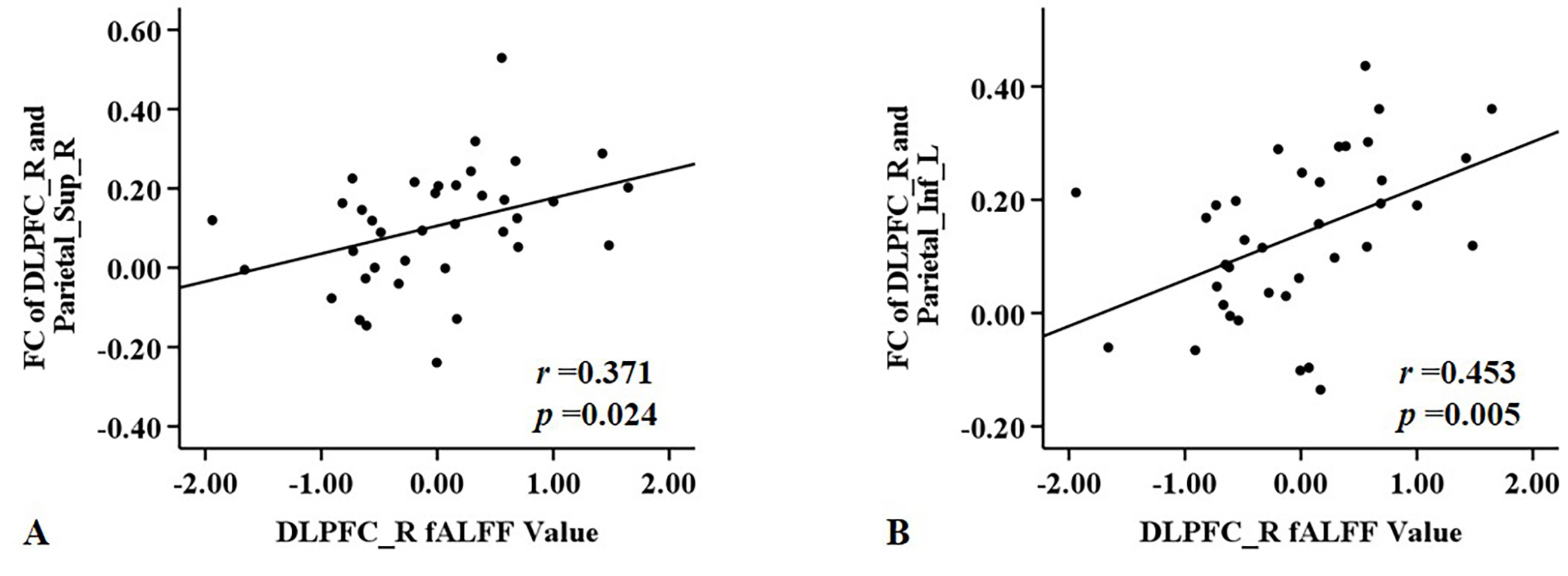 The fALFF values of the right DLPFC showed positive correlations with the FC values between the right DLPFC and right superior parietal gyrus (r = 0.371, p = 0.024) (Fig. 4A), and left inferior parietal gyrus (r = 0.453, p = 0.005) (Fig. 4B). The fALFF and FC values of the left DLPFC showed no significant correlation.