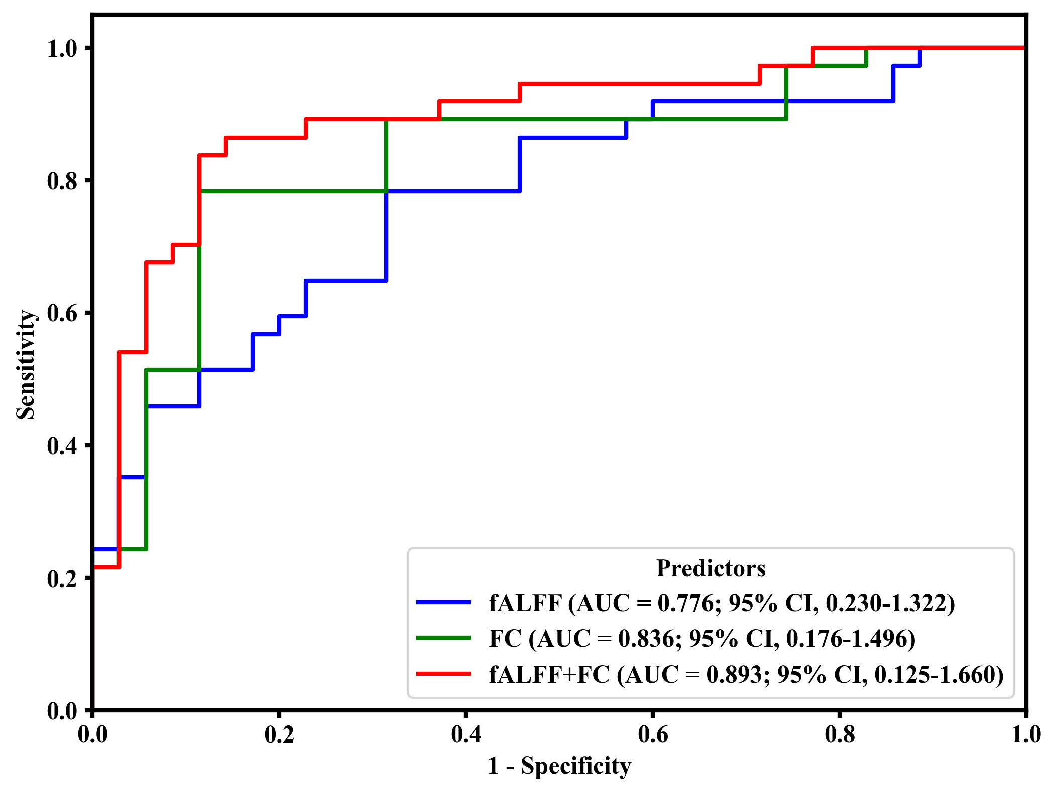 The fALFF (left DLPFC) and FC (right DLPFC and right middle frontal gyrus) correlated with cognitive function scores. These indicators were used to construct single-factor models and a joint predictive model. LOOCV and ROC curve analysis revealed the AUC for the fALFF value of the left DLPFC was 0.776 (95% CI: 0.230–1.322, accuracy: 69.4%, sensitivity: 70.3%, specificity: 68.6%, Youden index: 0.388, optimal cutoff: 0.481) (Fig. 5). The AUC for the FC between right DLPFC and right middle frontal gyrus was 0.836 (95% CI: 0.176–1.496, accuracy: 80.1%, sensitivity: 78.4%, specificity: 82.9%, Youden index: 0.612, optimal cutoff: 0.509) (Fig. 5). The AUC for the joint prediction probabilities of the fALFF and FC of the DLPFC was 0.893 (95% CI: 0.125–1.660, accuracy: 84.7%, sensitivity: 81.1%, specificity: 88.6%, Youden index: 0.697, optimal cutoff: 0.451) (Fig. 5).