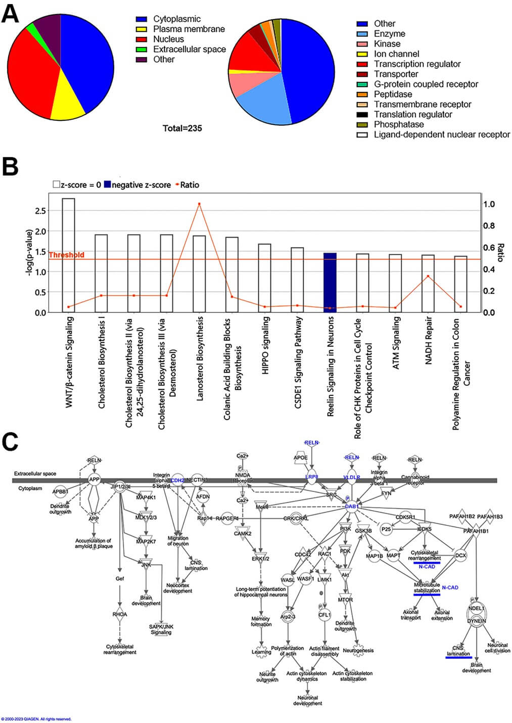 The IPA analysis of E12 dorsal prosencephalon transcriptome from Ctrl and Db pregnant rats [27] revealed 235 genes differentially expressed (129 downregulated and 106 upregulated; Supplementary Table 1). Proteins encoded by these genes are predominantly localized to the cytoplasm, nucleus, and plasma membrane (Fig. 1A), and are enriched for enzymes and transcription regulators, among others (Fig. 1B and Supplementary Table 1). Of the 13 Ingenuity canonical pathways detected, Reelin Signaling in Neurons was the only pathway with a non-zero z score and a significant but modest enrichment (–log p value = 1.45), with a negative z score predicting inhibition in the Db group (Fig. 1B, Table 3). This pathway falls within the categories of “Neurotransmitters and Other Nervous System Signaling; Organismal Growth and Development” IPA disease/functions annotations highlighted “Cell Morphology; Cellular Assembly and Organization; and Cellular Development” (Supplementary Table 2), supporting a model of impaired neuronal migration during corticogenesis in embryos from Db rats.