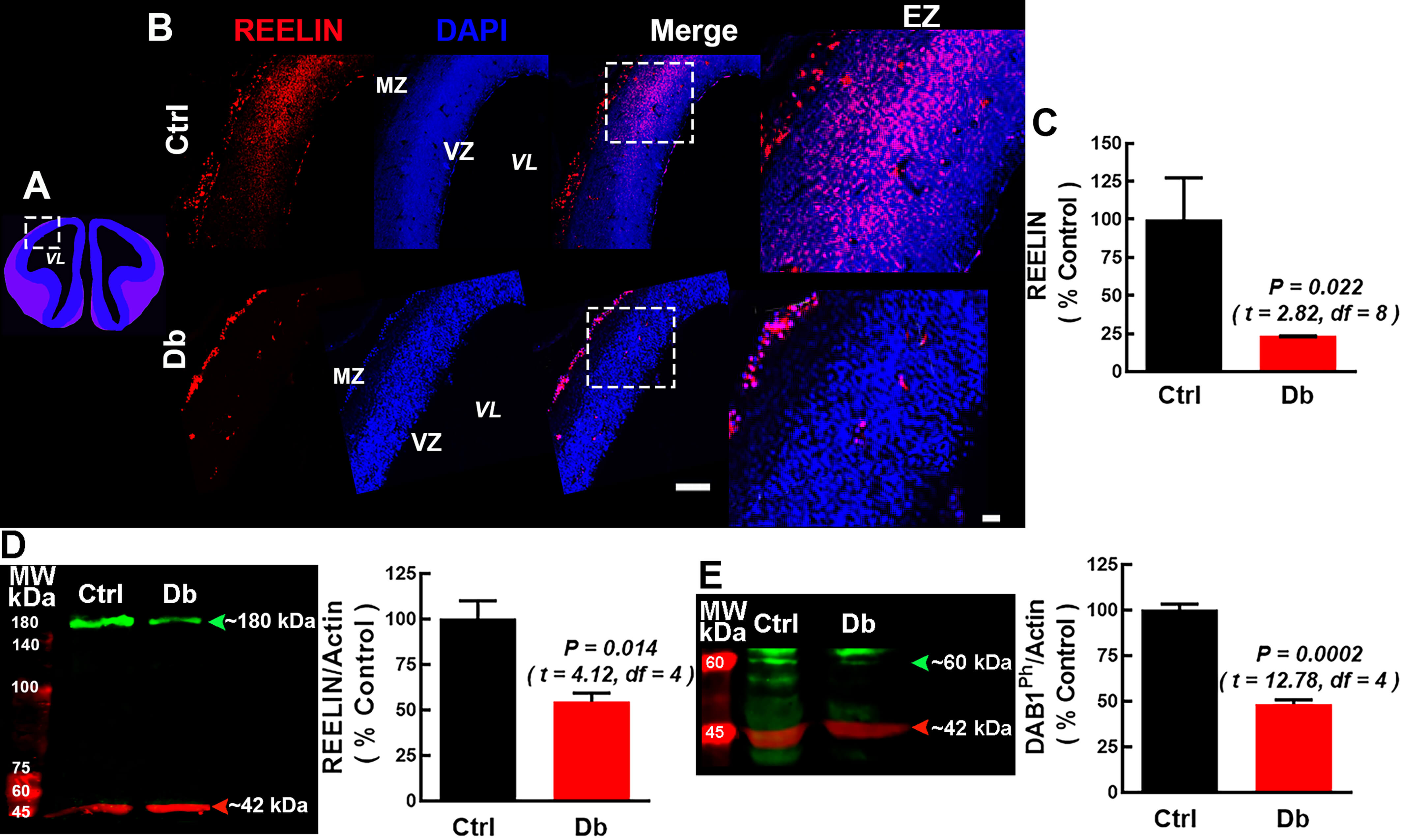 ApoER2/LRP8, and p-DAB1 were all reduced at E12 and E16 in embryos from Db dams.
