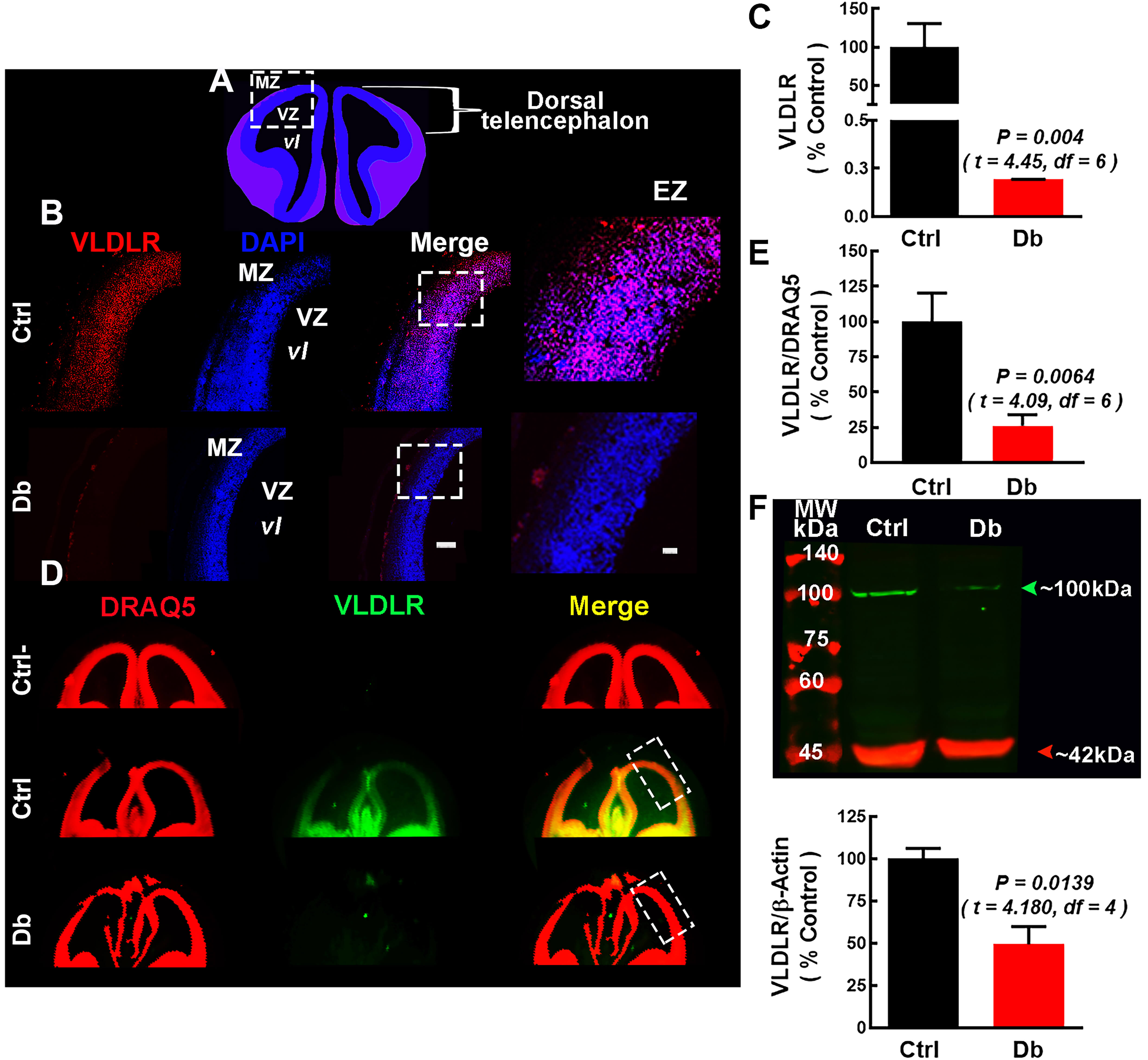 VLDLR is decreased at E16 in embryos from diabetic dams. (A)
