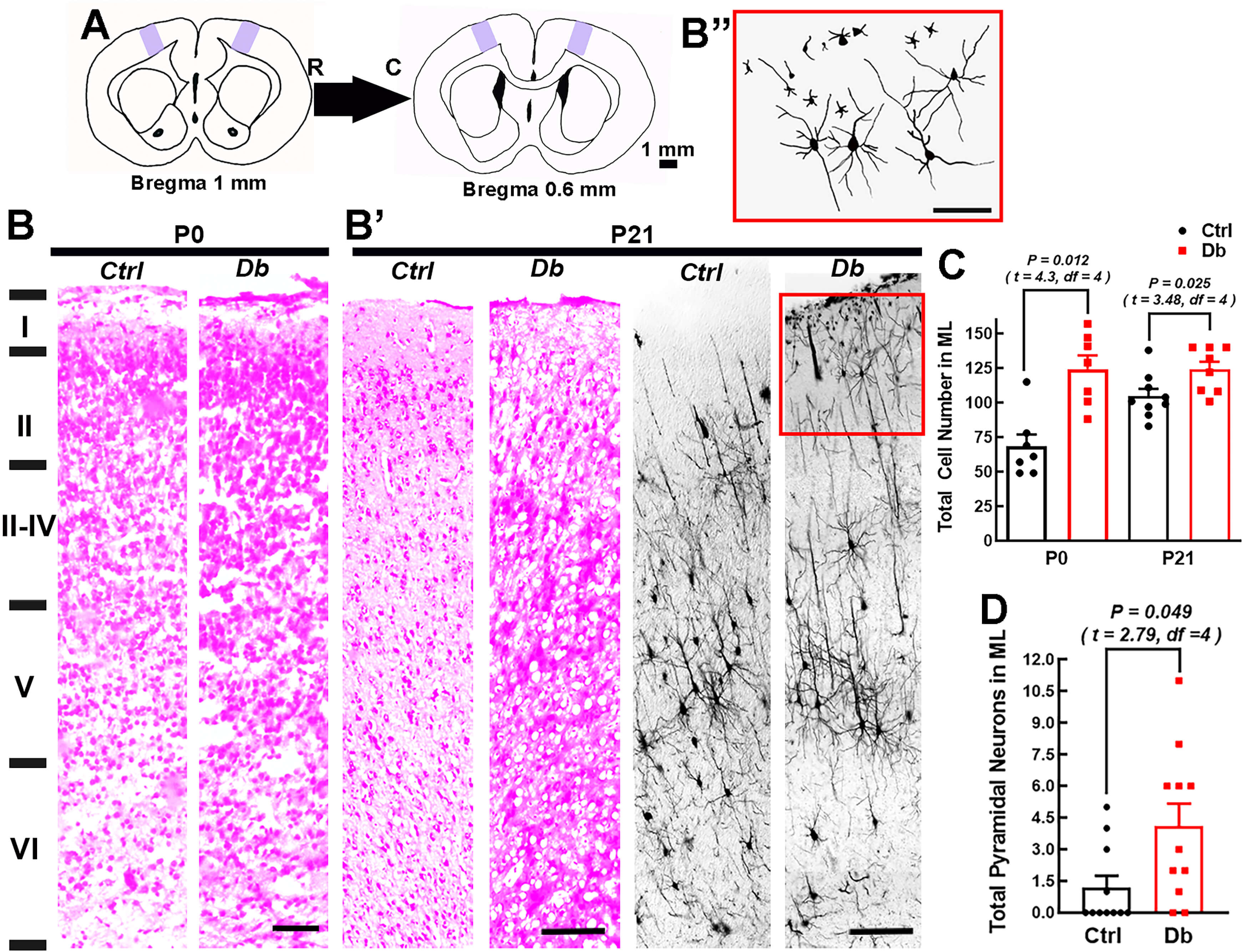 To assess postnatal consequences, we examined M1 cytoarchitecture at P0 and P21