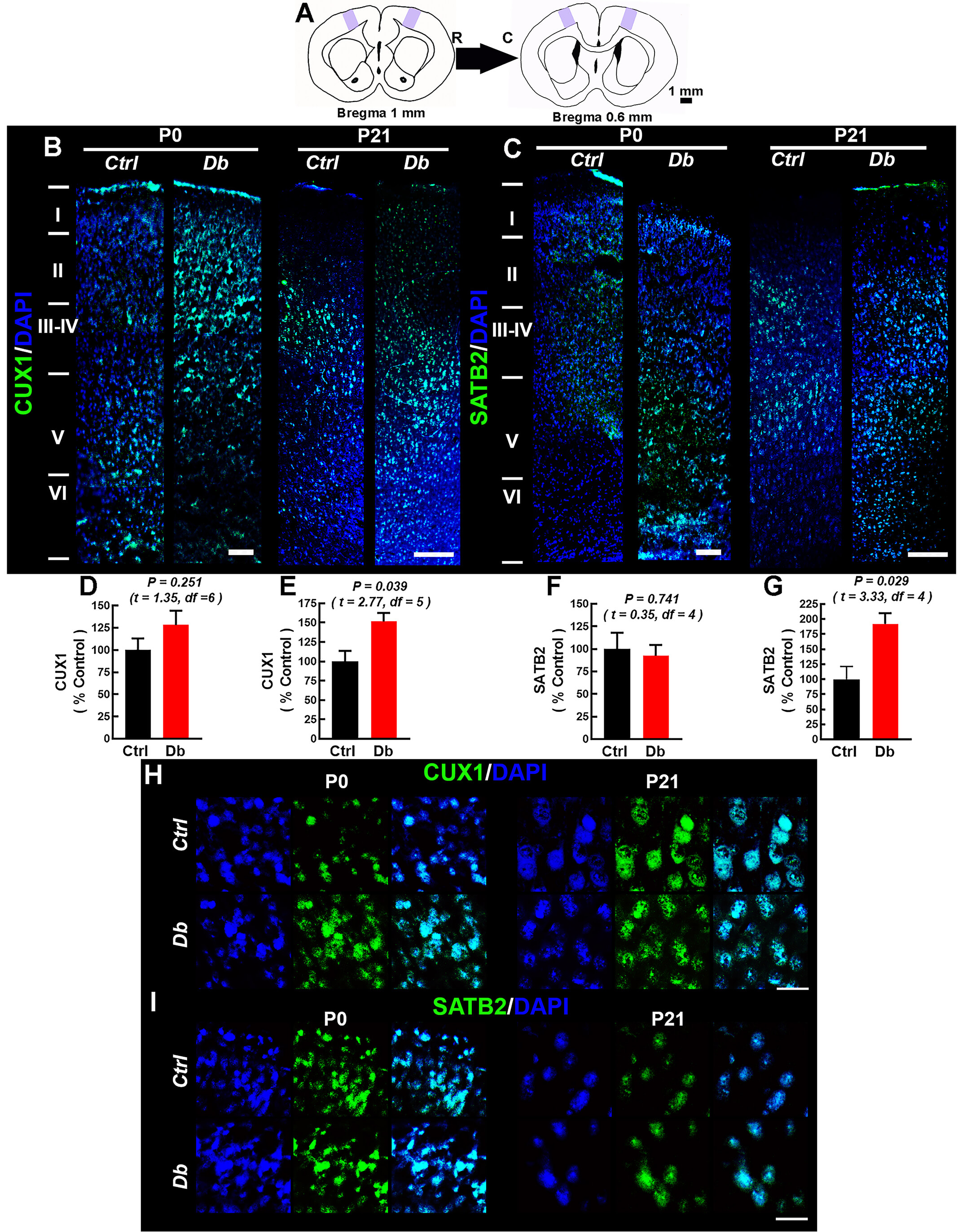 Finally, we mapped upper-layer neurons by Cut Like Homeobox 1 (CUX1) and Special AT-Rich Sequence-Binding Protein 2 (SATB2) immunofluorescence at P0 and P21 (Fig. 8A–I). As expected, Ctrl neonates (P0) exhibited deeper CUX1+ neurons (indicating ongoing migration), with predominantly II-IV expression at P21 (Fig. 8B,H). In Db, CUX1+ neurons at P0 were abnormally superficial; at P21, CUX1 signaling encroached upon layer I, and overall CUX1 intensity was higher than Ctrl (Fig. 8D,E). For SATB2, Ctrl showed labeling above layer V at P0 with minimal layer I signal by P21 (Fig. 8C,I). In Db, SATB2+ neurons were more broadly distributed across cortical depth at P0; by P21, SATB2 labeling no longer extended into layer I, yet overall SATB2 intensity remained elevated relative to Ctrl (Fig. 8F,G). Together with hematoxylin-eosin and Golgi-Cox, these data indicate scrambled-like lamination and ectopic layer I neurons consistent with attenuated RELN signaling.
