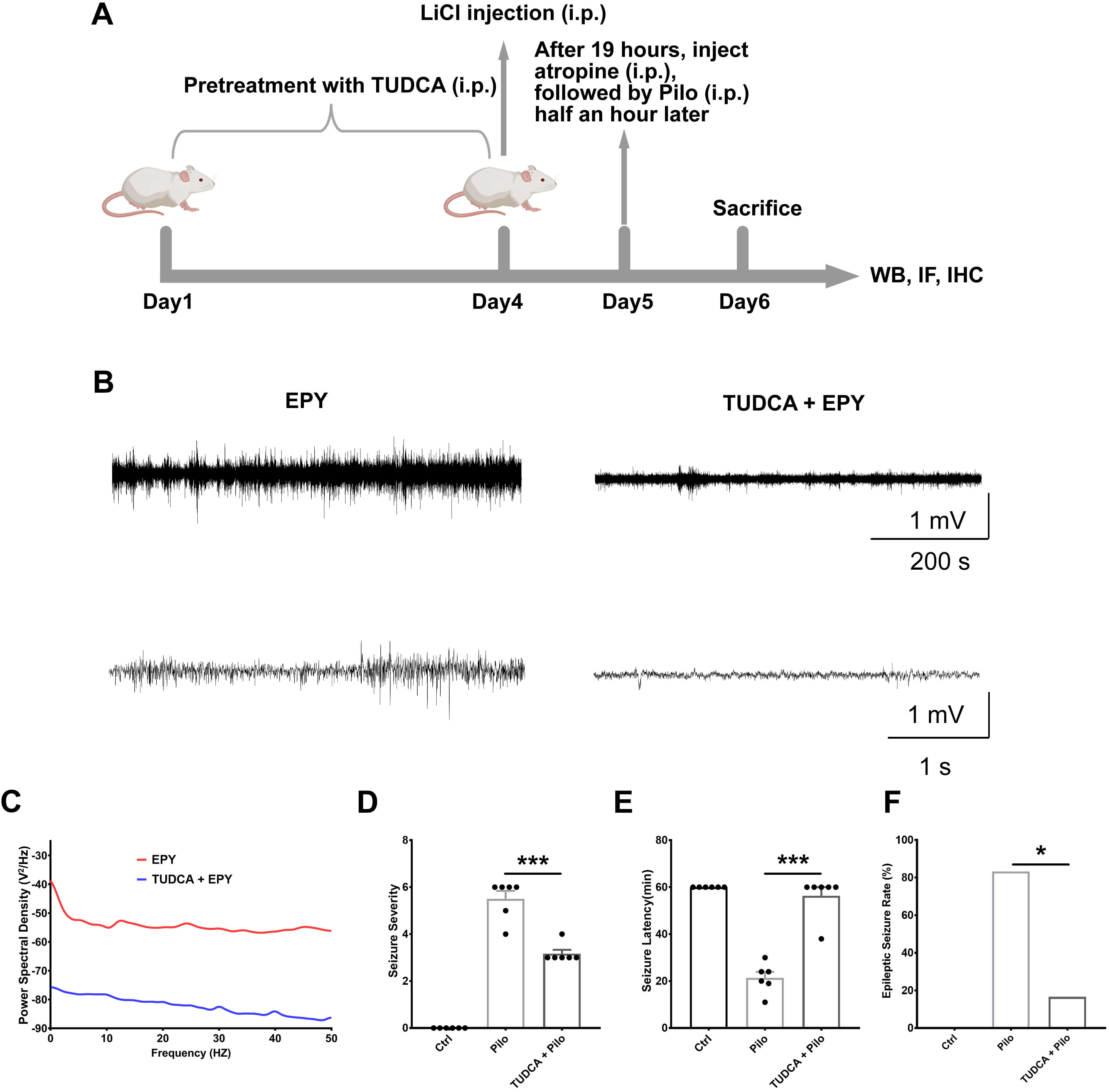 (D,E) Effects of TUDCA on seizure severity and seizure latency. (F) Statistical