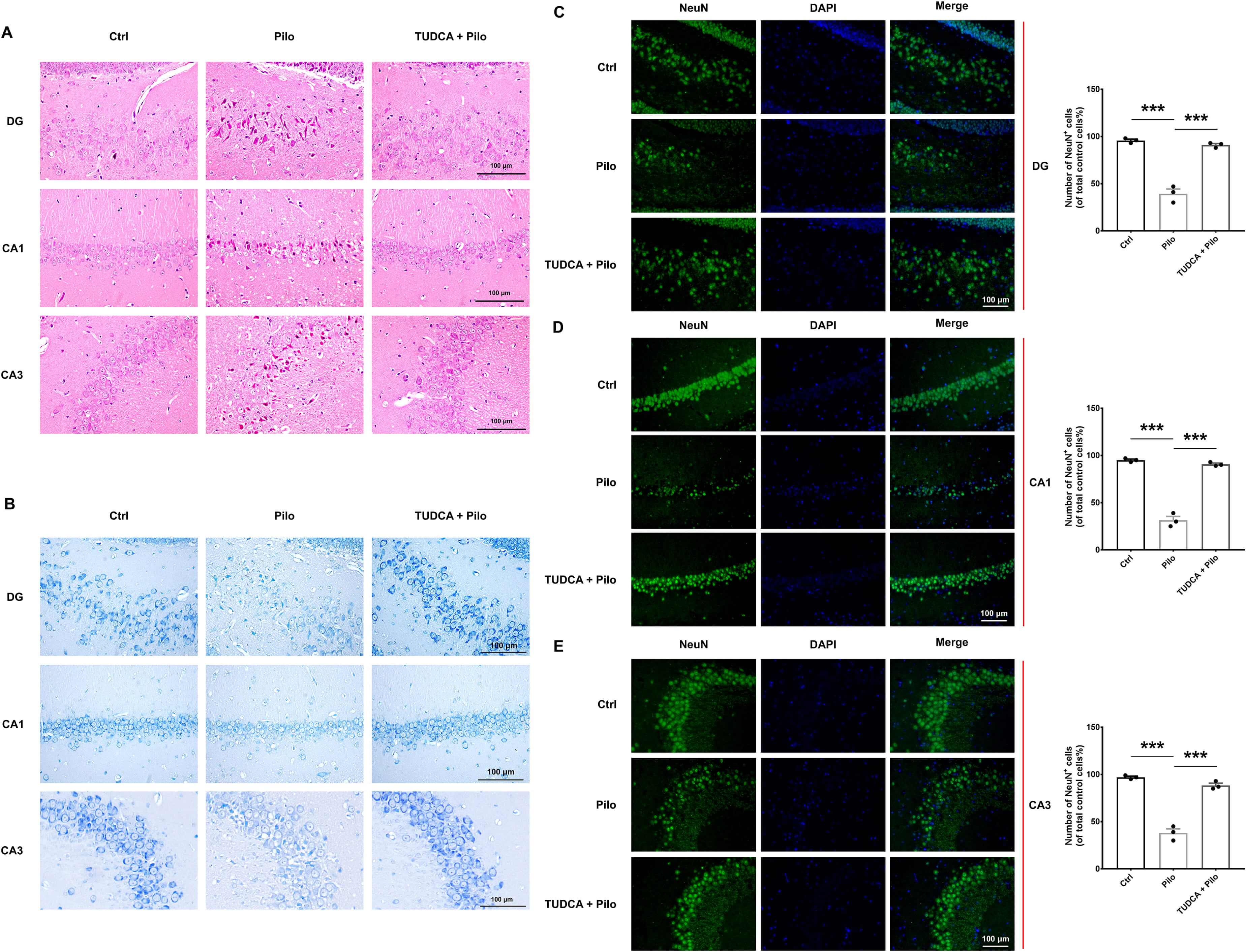 H&E staining results (Fig. 2A) revealed brain cell damage and morphological shrinkage in epileptic rats, while TUDCA pretreatment could alleviate the degree of cell damage. Subsequently, to further investigate neuronal alterations, we additionally performed Nissl staining and the neuronal marker NeuN immunostaining. Nissl staining results (Fig. 2B) showed that the Pilo group exhibited significant neuronal loss, while TUDCA pretreatment reduced neuronal loss and resulted in more intact neuronal morphology. Similarly, as shown in the neuronal marker NeuN immunostaining results in Fig. 2C–E, TUDCA pretreatment increased the number of surviving neurons. Furthermore, by comparing the control group with the TUDCA + Pilo group, we can determine that TUDCA can prevent or alleviate neuronal damage.
