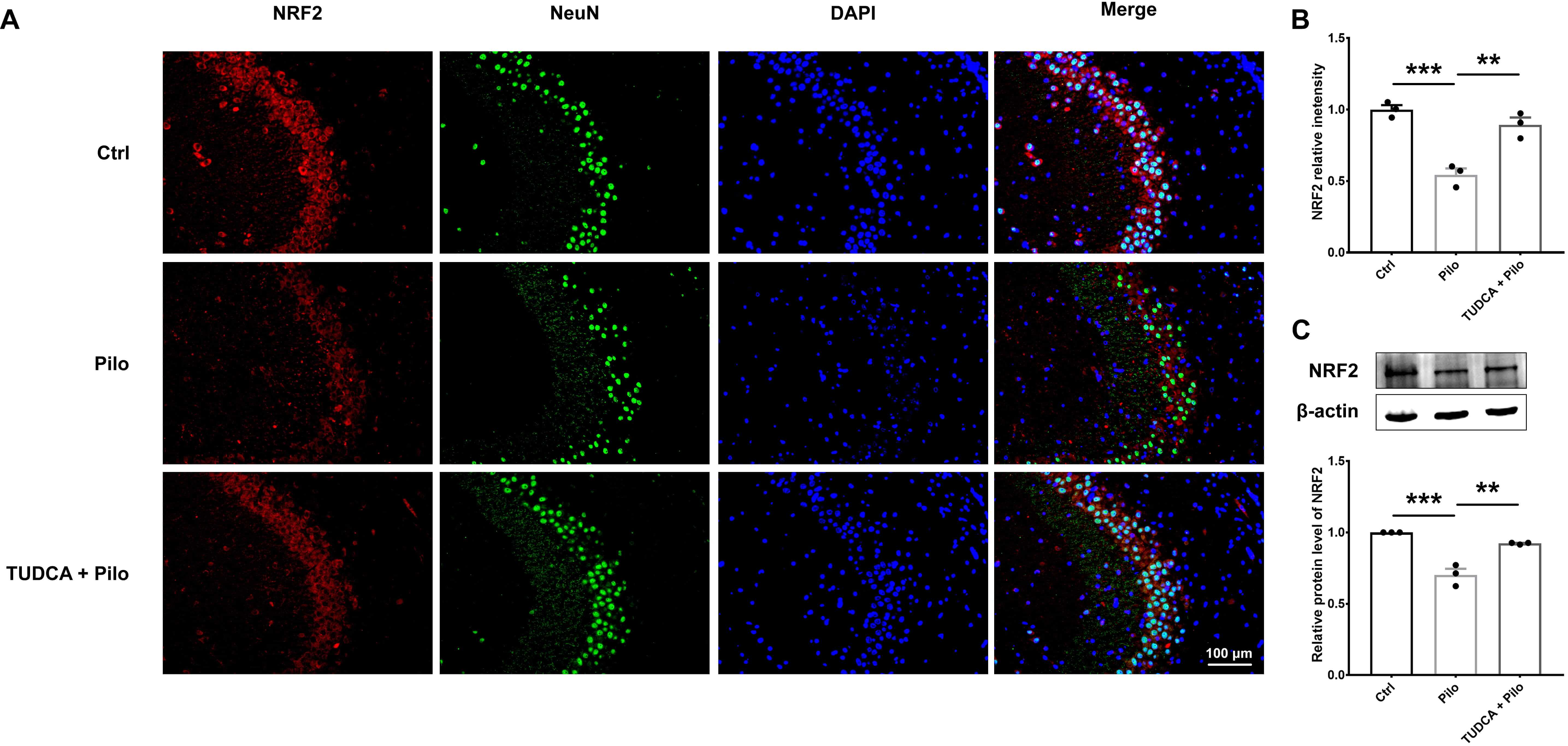 The etiology and pathogenesis of epilepsy remain complex and incompletely understood. NRF2 is a master transcriptional regulator that enhances neuronal resistance to oxidative stress and glutamate-induced excitotoxicity, mitigating lipid peroxidation and maintaining cellular redox balance [32]. It is also closely linked to the inhibition of ferroptosis [33]. Under normal conditions, NRF2 is sequestered in the cytosol by its repressor Keap1 and degraded via proteasomal pathways [34]. Under conditions of oxidative stress or other perturbations to cellular homeostasis, NRF2 translocates into the nucleus, binds to the antioxidant response element, promoting antioxidant activity through the upregulation of target genes such as GPX4, thereby initiating a protective response [35, 36]. Additionally, HO-1, a gene dependent on NRF2, is markedly upregulated when exposed to lethal stimuli like oxidative stress [37]. Studies have shown that HO-1 expression is considerably elevated in the epilepsy model [38, 39]. This is consistent with the results we have obtained. Upregulation of HO-1 induces Fe2+ overload and ROS accumulation, thereby contributing to the initiation of ferroptosis [40]. Thus, activating NRF2 may enhance the expression of antioxidant enzymes, reducing oxidative stress and potentially alleviating seizures. In the present study, NRF2 expression was significantly reduced and HO-1 expression was markedly increased following Pilo-induced epilepsy. However, TUDCA treatment significantly elevated NRF2 expression and inhibited the upregulation of HO-1. At the cellular level, TUDCA treatment promoted NRF2 expression and facilitated its nuclear translocation. These findings suggest that activating NRF2 enhances cellular antioxidant capacity, contributing to the neuroprotective effects of TUDCA.