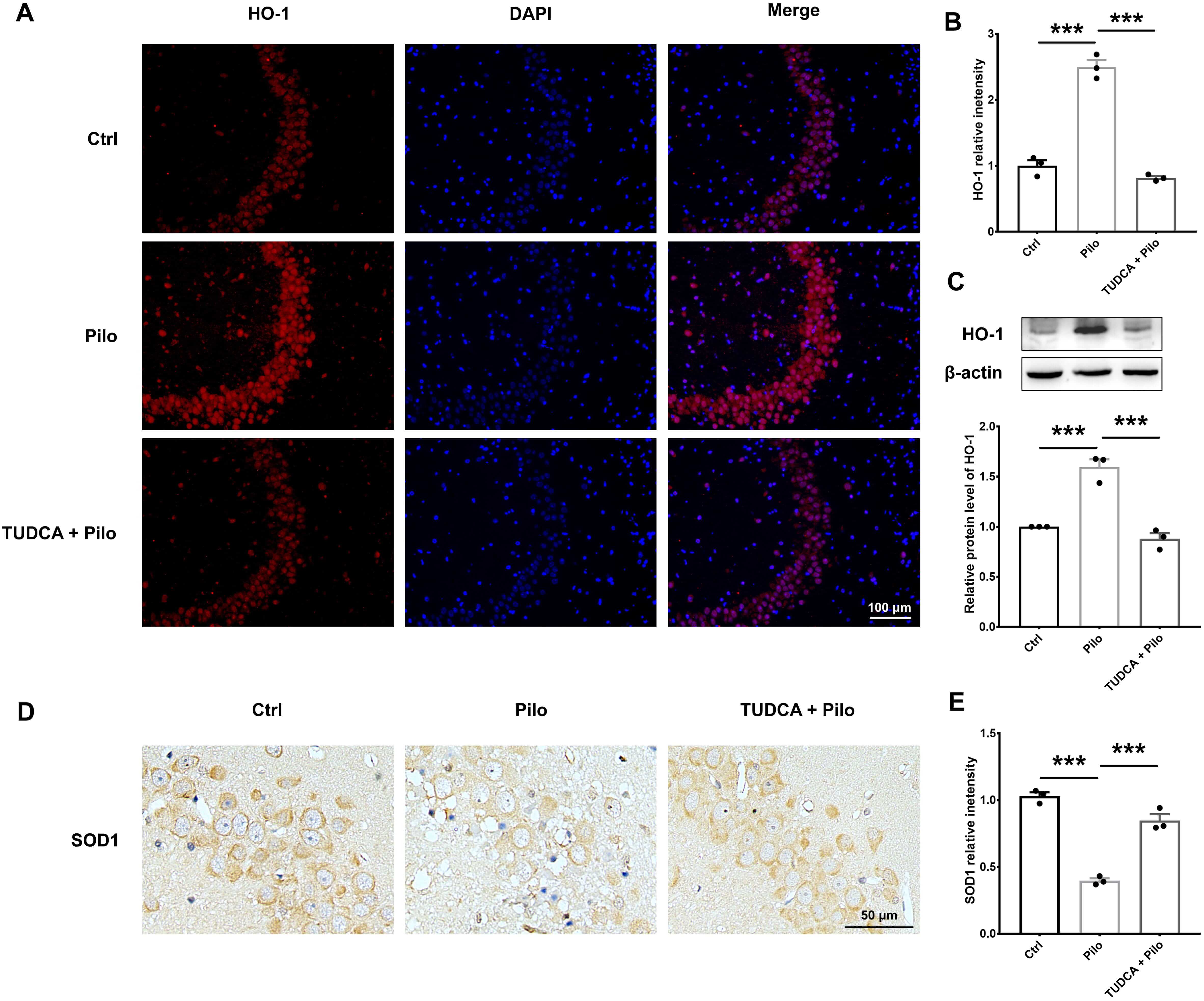 In addition to neuronal damage, immunofluorescence and Western blot were performed to examine oxidative stress-related markers, including NRF2, HO-1, and SOD1. As shown in Fig. 3A–C and Supplementary Fig. 1A,B, compared to the control group, NRF2 expression was markedly reduced in the brains of epileptic rats, TUDCA pretreatment inhibited the pilocarpine-induced reduction in NRF2 protein levels (The original Western blot images can be found in the Supplementary Material – Original Western Blot Images). Similarly, as shown in Fig. 4A–C and Supplementary Fig. 2A,B, the expression of HO-1 was significantly elevated in the model group relative to the control rats, and TUDCA pretreatment mitigated this increase (The original Western blot images can be found in the Supplementary Material – Original Western Blot Images). Consistent with these results, the expression levels of SOD1 also showed similar trends (Fig. 4D,E; Supplementary Fig. 3A,B). These data suggest that TUDCA effectively alleviates oxidative stress in Pilo-induced epilepsy rats.