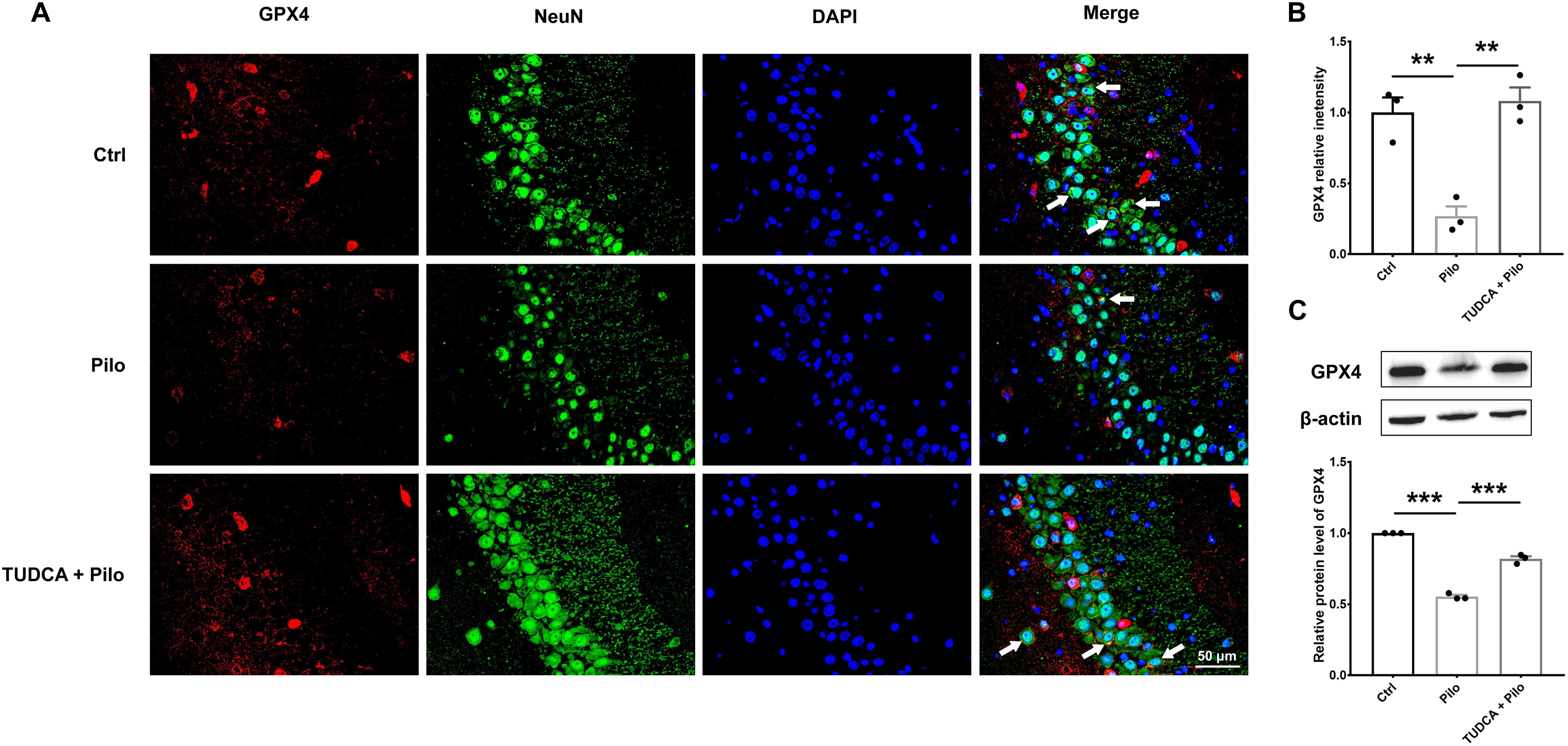 GPX4 expression was measured by immunofluorescence and Western blot analysis. As shown in Fig. 5A,B and Supplementary Fig. 4A,B, GPX4 expression was significantly reduced in the Pilo-induced epilepsy model group compared to the control group, while expression levels were notably increased in the TUDCA pretreatment group. Western blot analysis corroborated these findings (Fig. 5C, the original Western blot images can be found in the Supplementary Material – Original Western Blot Images), indicating that TUDCA effectively inhibits ferroptosis in Pilo-induced epilepsy rats.