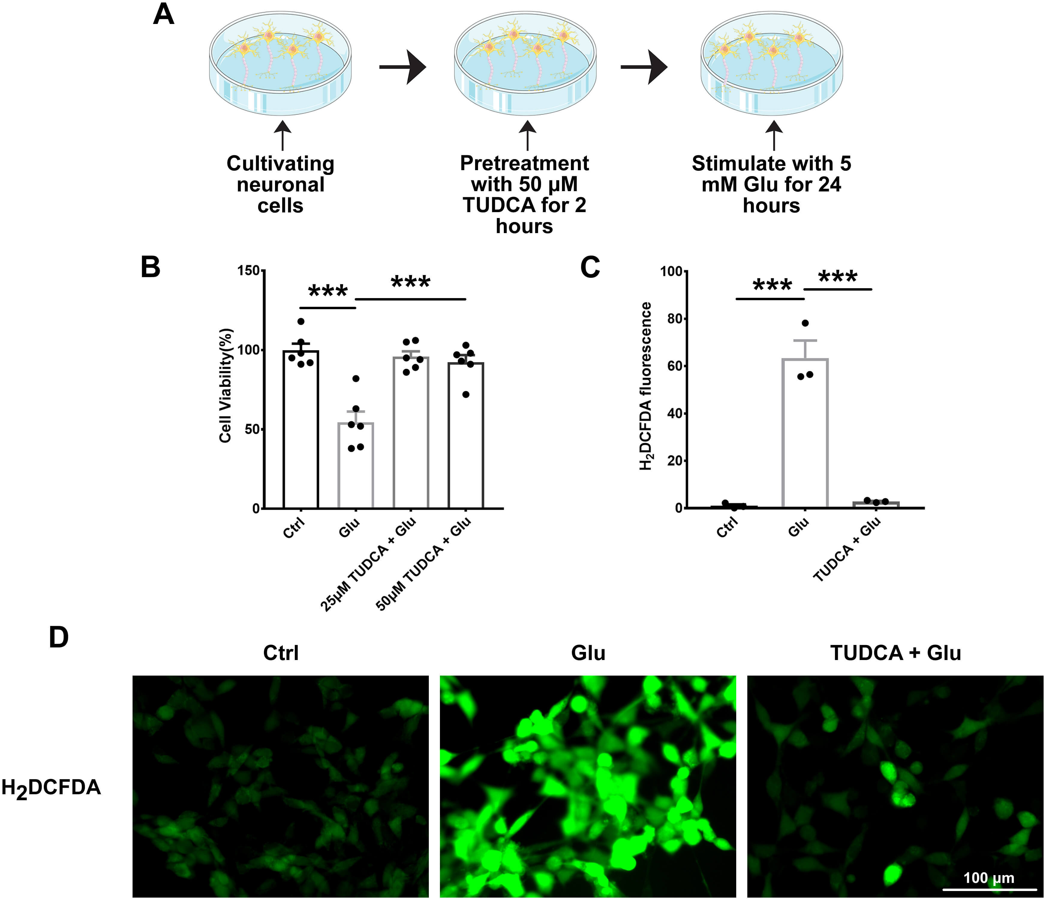 Induction of an in vitro neuronal excitotoxic injury model by stimulating neuronal cells with glutamate. HT22 cells were divided into three groups: (1) the control group, cultured under normal conditions without treatment; (2) the Glu group, treated with 5 mM glutamate for 24 hours to induce neuronal excitotoxic injury; (3) the TUDCA + Glu group, pretreated with 50 µM TUDCA for 2 hours and then stimulated with 5 mM glutamate for 24 hours.