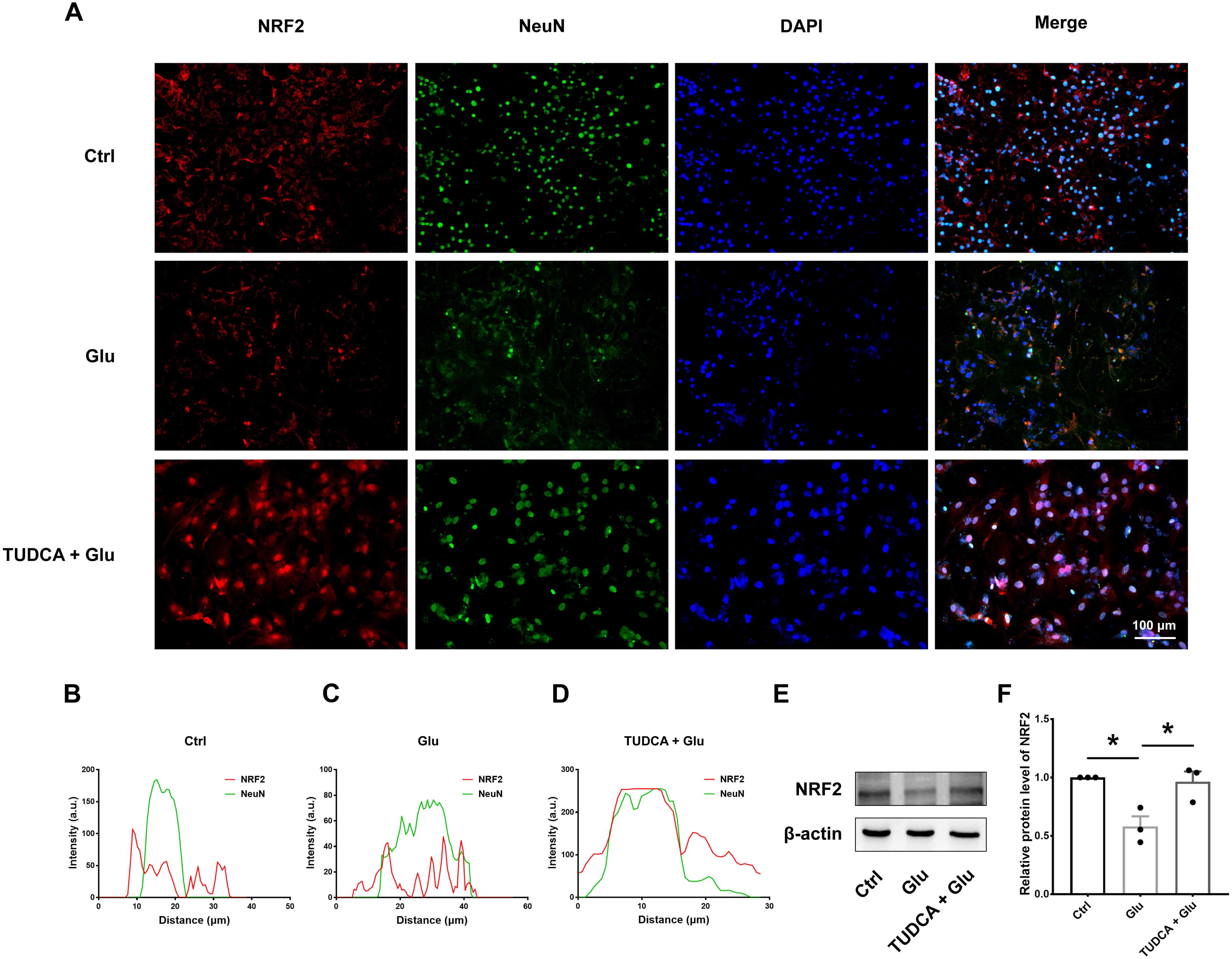 Immunofluorescence and Western blot analyses were also performed to assess the expression of the oxidative stress-related marker NRF2. Representative immunofluorescence images of NRF2 and NeuN are shown for Ctrl, Glu, and TUDCA + Glu conditions (Fig. 7A). Kymographs (Fig. 7B–D) were generated, and the signal intensity profiles of NeuN (green) and NRF2 (red) were quantified and analyzed. Fig. 7E,F (The original Western blot images can be found in the Supplementary Material – Original Western Blot Images.) presents a histogram showing the relative NRF2 protein levels across Ctrl, Glu, and TUDCA + Glu conditions. Overall, these data indicate that TUDCA promotes the nuclear translocation of NRF2 in glutamate-treated neurons.