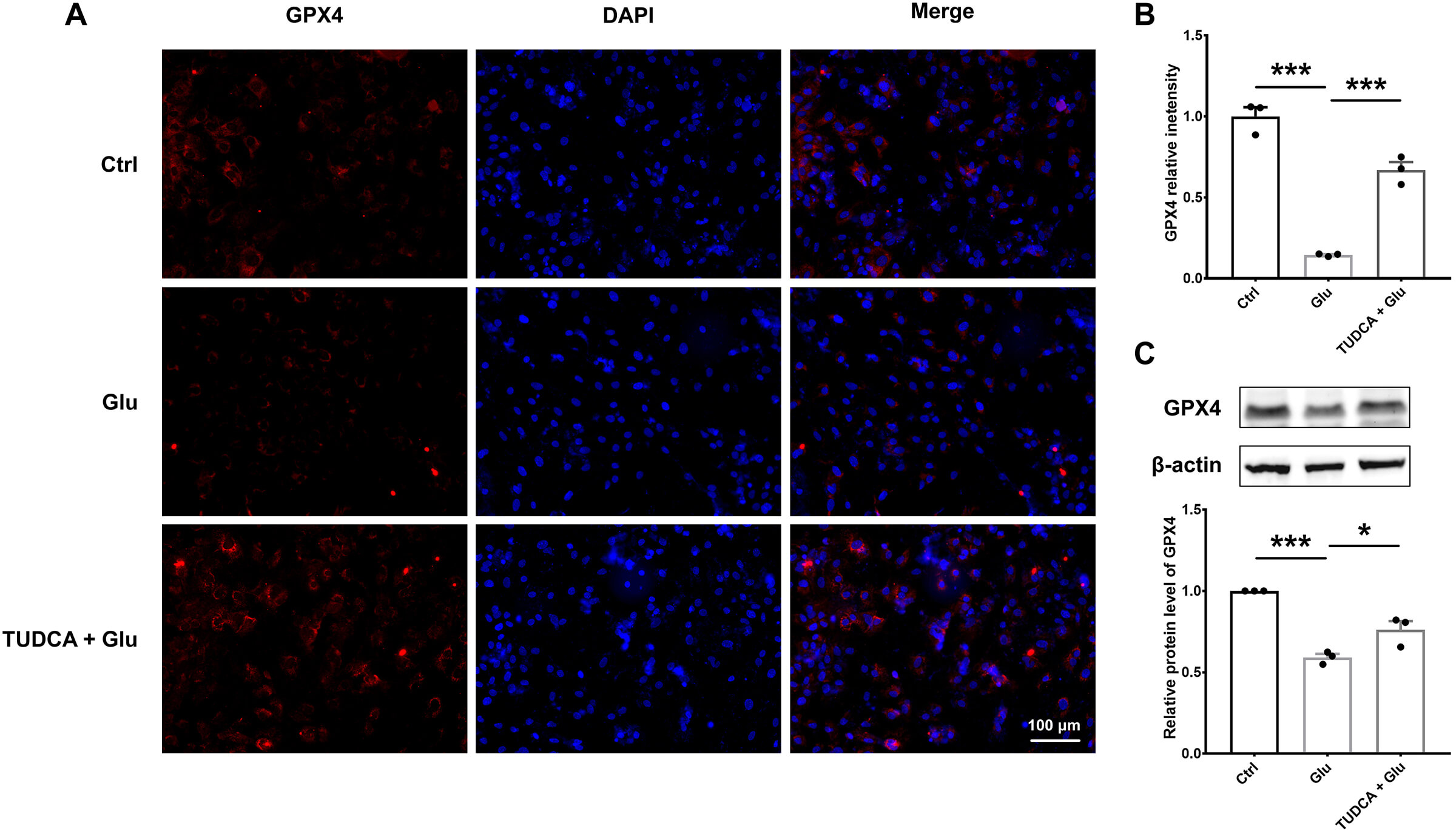 To explore the mechanism by which TUDCA protects against neuronal ferroptosis, GPX4 expression was detected via immunofluorescence and Western blot in the Glu-induced neuronal death model. As shown in Fig. 8A,B, the Glu group exhibited reduced GPX4 expression relative to the control group. However, TUDCA pretreatment significantly reversed the reduction in GPX4 levels. Western blot results (Fig. 8C, the original Western blot images can be found in the Supplementary Material – Original Western Blot Images) confirmed that the expression of GPX4 in the Glu group was significantly decreased, while TUDCA inhibited the decrease in GPX4 expression. These findings, consistent with the in vivo data, strongly suggest that TUDCA mitigates neuronal cell death by regulating ferroptosis and oxidative stress.
