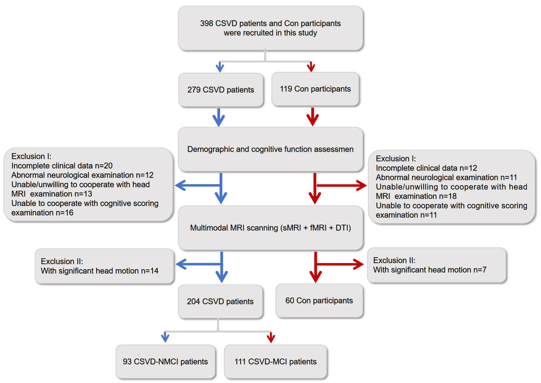 Overview of participant recruitment and exclusion for CSVD patients and controls. CSVD, cerebral small vessel disease; DTI, diffusion tensor imaging; CSVD-MCI, CSVD patients with mild cognitive impairment; CSVD-NMCI, CSVD patients without mild cognitive impairment; Con, control group; MRI, magnetic resonance imaging; sMRI, structural magnetic resonance imaging; fMRI, functional magnetic resonance imaging.