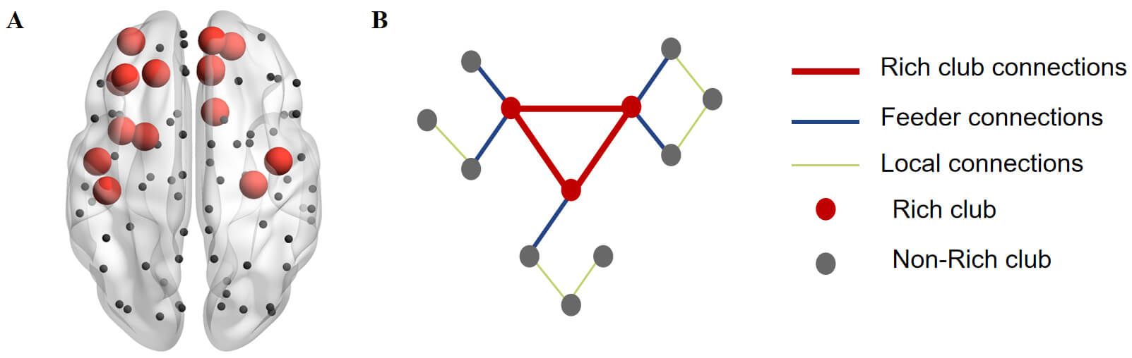 Schematic illustration of local, feeder, and rich-club connections. (A) Rich-club nodes (red) and peripheral regions (black) identified across all groups. (B) Classification of structural network connections. For each category—rich-club, feeder, and local—the overall “connection strength” was computed as the sum of the edge weights within that group.