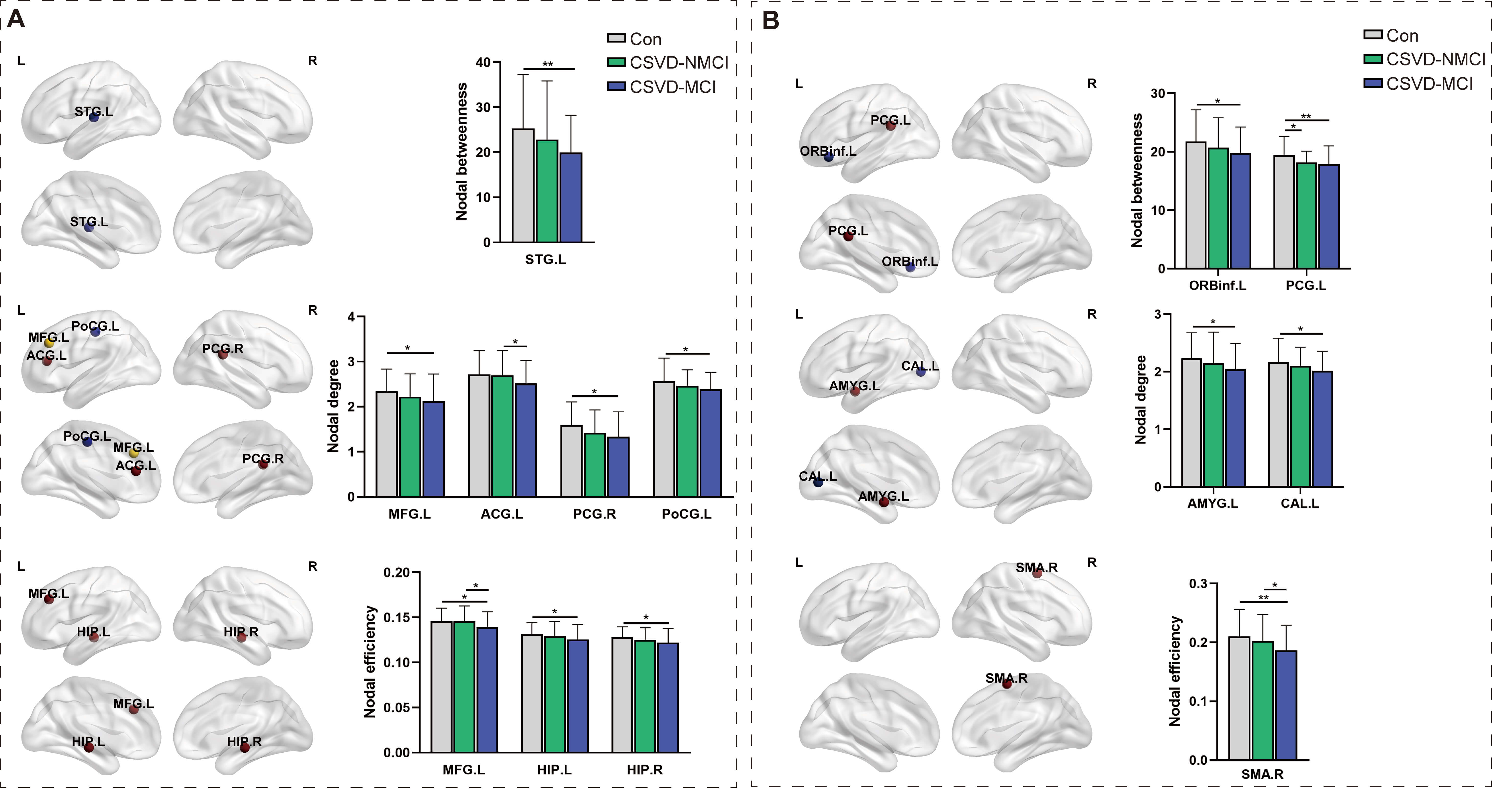 Within the functional network, the CSVD-NMCI group exhibited lower centrality in the PCG.L compared with controls. The CSVD-MCI group, relative to controls, showed reduced centrality in the left inferior orbitofrontal gyrus (ORBinf.L) and PCG.L, decreased node degree in the left amygdala (AMYG.L) and left calcarine gyrus (CAL.L), and diminished nodal efficiency in the right supplementary motor area (SMA.R). Compared with the CSVD-NMCI group, the CSVD-MCI group demonstrated further reduction in nodal efficiency of the SMA.R (Fig. 5B; Supplementary Table 3).