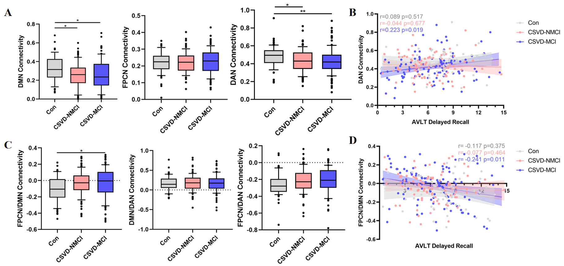 Our study found that FC within the DMN and DAN was significantly reduced in CSVD-MCI patients. Reduced connectivity between the FPCN and DMN was also observed, which was significantly correlated with AVLT performance. The DAN supports attention to external stimuli [48], whereas the DMN plays a key role in episodic memory [49]. The FPCN appears to function as a bridge, coordinating with both the DMN and DAN to facilitate goal-directed cognitive processes [50]. In this context, reduced intra-network connectivity in DMN and DAN, combined with increased FPCN-DMN coupling that was negatively associated with memory performance, may reflect a maladaptive reorganization in which additional control resources are recruited but fail to fully compensate for underlying damage. Even though overall CSVD burden scores were comparable between the CSVD-NMCI and CSVD-MCI groups, selective damage to periventricular and deep frontal white-matter pathways linked to the FPCN and DMN may underlie the reduced network efficiency and associated impairments in memory.