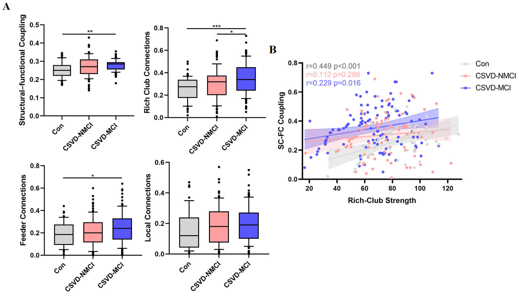 In conclusion, elderly patients with CSVD, particularly those with MCI, show impaired efficiency and integrity of both structural and functional networks related to cognition. These alterations manifest as slower and less efficient information transfer, reduced robustness, and diminished neural processing resources. Changes in FC within and between the FPCN, DMN, and DAN likely represent a mixture of compensatory and maladaptive reorganization in response to small-vessel-related damage. Disproportionate vulnerability of rich-club regions and their connecting pathways appears to play a central role in the development of cognitive impairment. Abnormal increases in SC-FC coupling, especially in rich-club-related connections, further highlight the complex restructuring of the brain’s communication in CSVD. Together, these findings provide network-based insights into how CSVD contributes to cognitive dysfunction and underscore the need for early detection and targeted interventions.