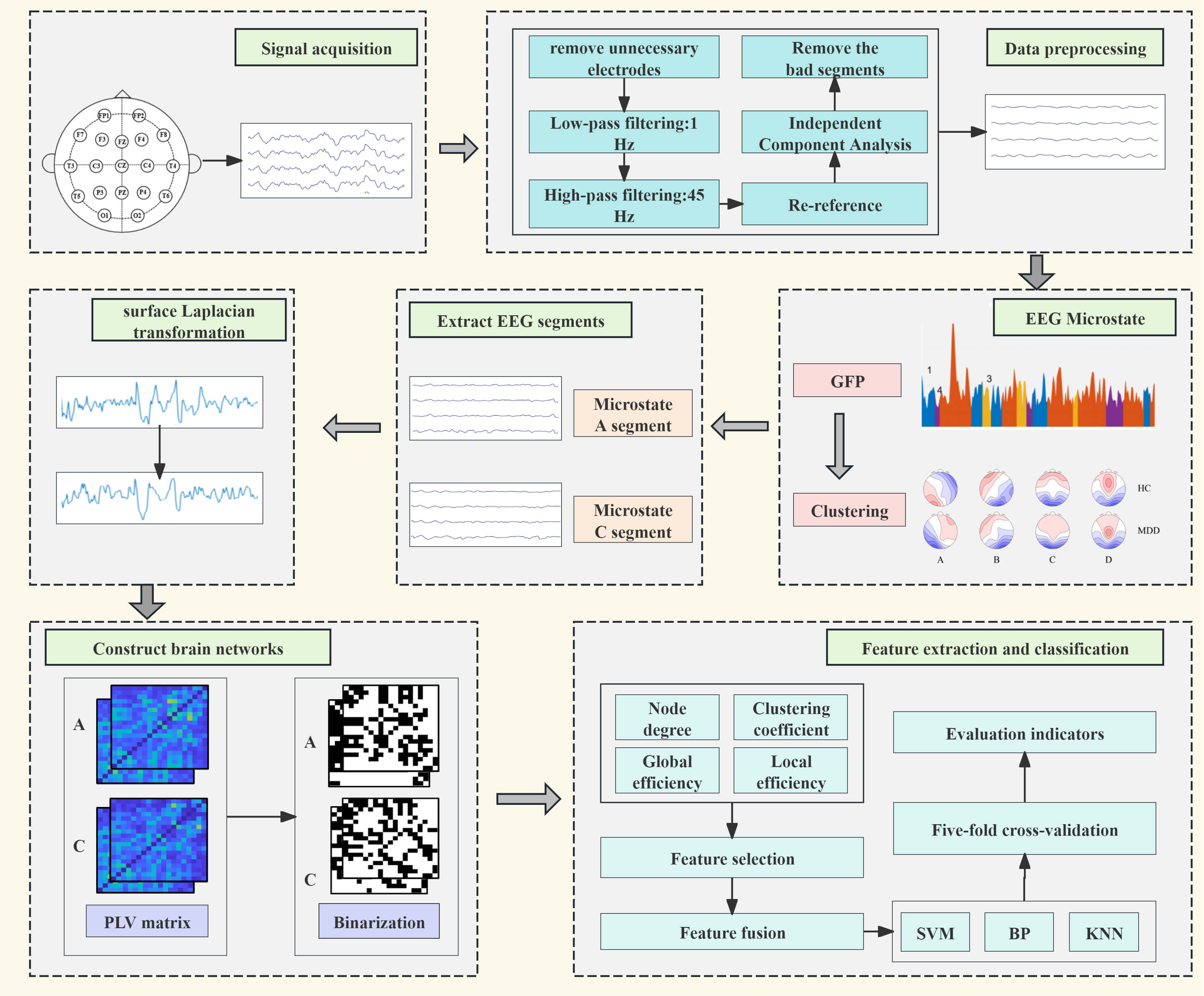 Dynamic functional connectivity flowchart. EEG, electroencephalogram; GFP, Global Field Power; PLV, phase locking value; SVM, Support Vector Machine; BP, Backpropagation Neural Network; KNN, K-Nearest Neighbors; FP, frontal pole; F, frontal; FZ, frontal zero; C, central; CZ, central zero; T, temporal; P, parietal; O, occipital; MDD, major depressive disorder; HC, healthy controls.