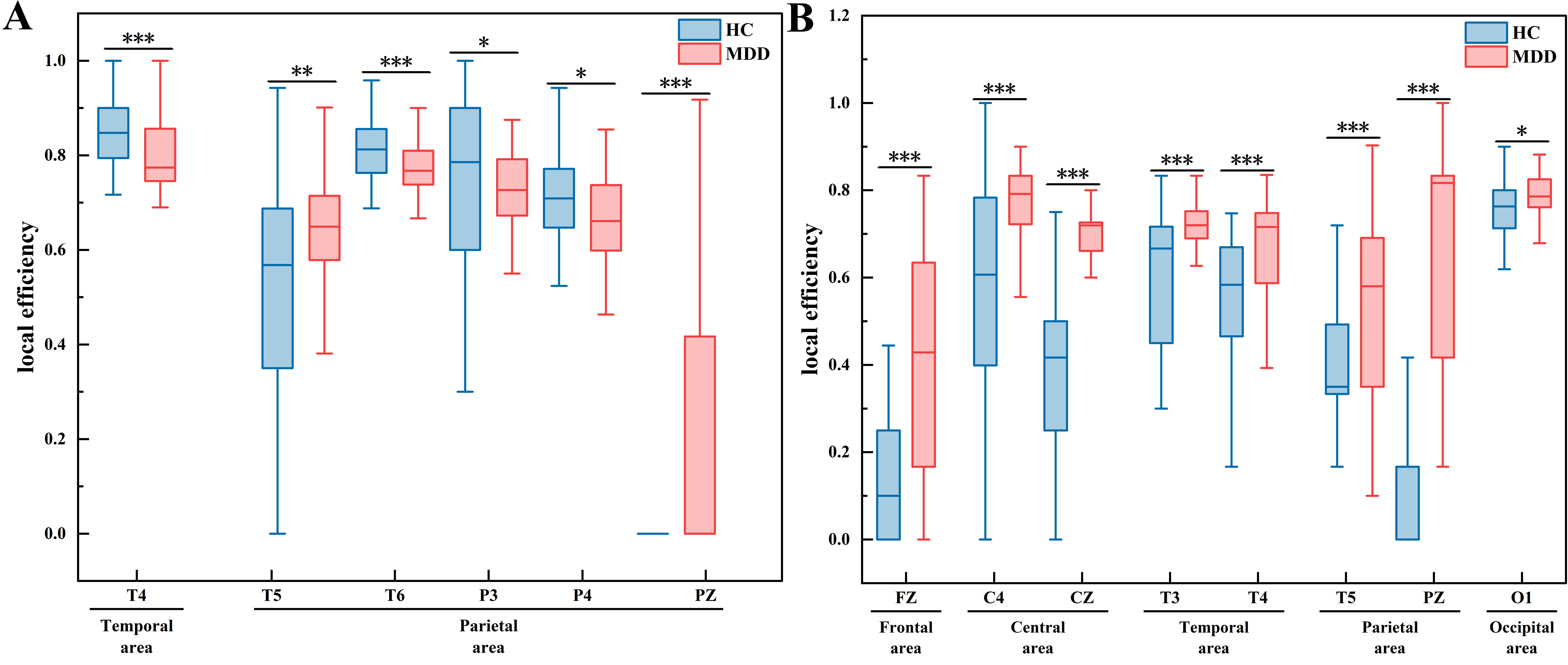 Analysis of brain network parameters showed the following: (1) Nodal connectivity was higher in patients with depression than in healthy controls, with statistically significant group differences observed only in microstate C, suggesting hyperactive neural engagement during salience-network-related states. For microstate A, significant between-group differences in node degree were found in the frontal region (F7, F8), central region (C3, CZ), temporal region (T3, T4), and parietal region (P3, T6, PZ). For microstate C, significant differences were observed in the frontal region (F3, FZ), central region (C3, CZ), temporal region (T3, T4), and parietal region (P3, T5, T6, PZ). (2) In microstate A, the clustering coefficient was higher in healthy controls than in the depression group, whereas in microstate C, the clustering coefficient was significantly higher in the depression group. This pattern suggests that healthy controls may show stronger information transmission and processing during microstate A, while patients with depression exhibit stronger capabilities during microstate C. For microstate A, significant differences in clustering coefficient were observed at electrodes in the prefrontal area (FP2), frontal area (F8), temporal area (T4), and parietal area (T6, P3, P4, PZ). For microstate C, significant differences were detected in the frontal area (FZ), central area (C4, CZ), temporal area (T3, T4), parietal area (T6, PZ), and occipital area (O1). (3) Global efficiency was higher in the depression group than in healthy controls for both microstates A and C, but this difference reached statistical significance only in microstate C. This indicates faster whole-brain information transmission in patients with depression during these microstates. (4) Local efficiency was also higher in the depression group for both microstates A and C, with statistically significant differences again limited to microstate C. This suggests enhanced local information transfer within brain regions in patients with depression. For microstate A, significant differences in local efficiency were found in the temporal region (T4) and parietal region (T5, T6, P3, P4, PZ). For microstate C, significant differences were observed in the frontal region (FZ), central region (C4, CZ), temporal region (T3, T4), parietal region (T5, PZ), and occipital region (O1).