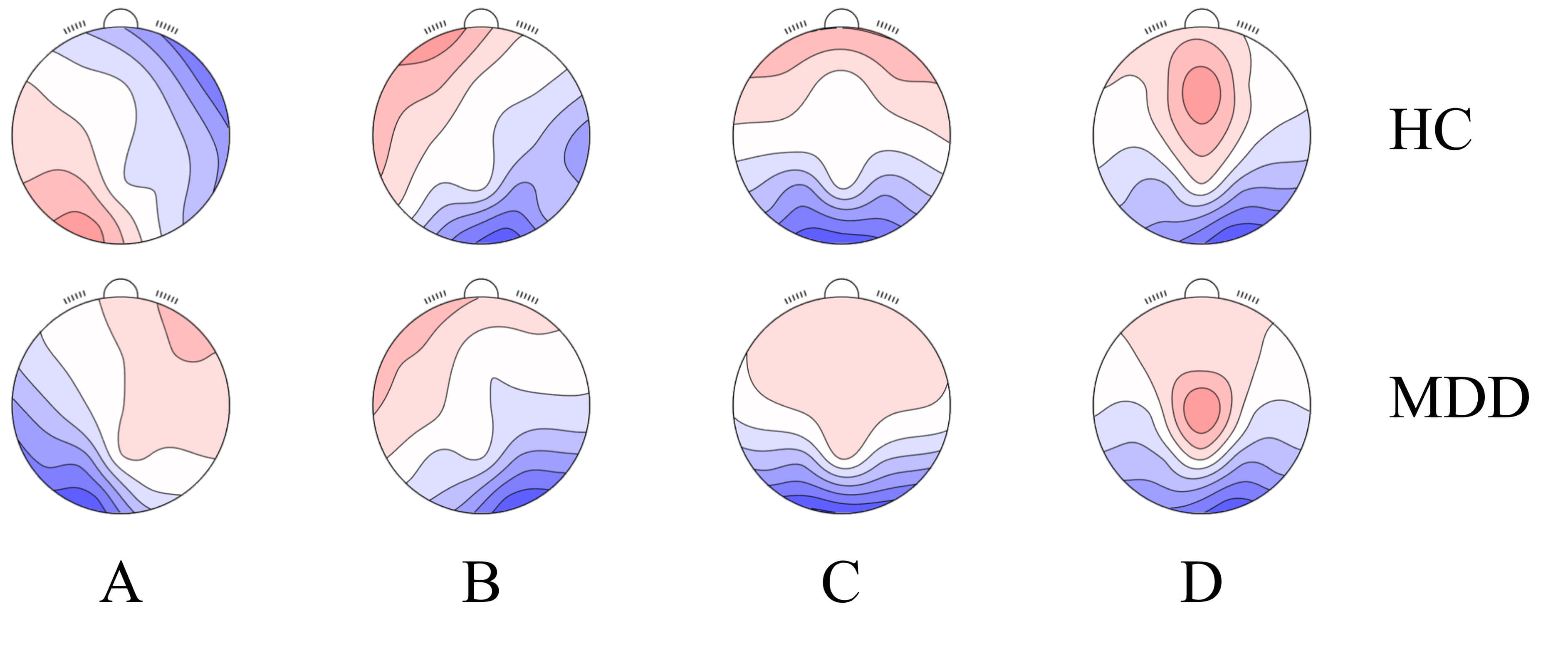 To overcome the limitations of static analysis, this study adopts a brain electrical microstate functional connectivity approach. Based on the property of microstates as reliable dynamic representations of the whole-brain network at the millisecond scale, this method can effectively capture transient patterns of brain function, opening a new avenue for extracting dynamic abnormal features in mental disorders such as depression [13]. A previous studies has confirmed the potential of this approach for identifying abnormal brain function. Research has shown that dynamic properties of theta and alpha band brain networks, derived from microstate functional connectivity under psychological load, provide potential biomarkers for cognitive state recognition [14]. Likewise, research on disorders of consciousness have demonstrated that microstate-derived dynamic network features can differentiate between varying levels of impairment, further supporting the general applicability of this method for identifying psychopathological states [15].