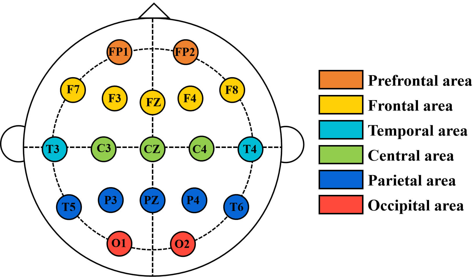 The nomenclature of the electrode sites is as follows: FP (frontal pole), F (frontal), FZ (frontal zero), C (central), CZ (central zero), T (temporal), P (parietal), and O (occipital). The data from 19 channels were divided into different brain regions. The prefrontal area includes: FP1, FP2; the frontal area includes: F3, F7, FZ, F4, F8; the central area includes: C3, CZ, C4; the temporal area includes: T3, T4; the parietal area includes: T5, T6, P3, P4, PZ; the occipital area includes: O1, O2. The schematic diagram of brain regions is shown in Fig. 3.