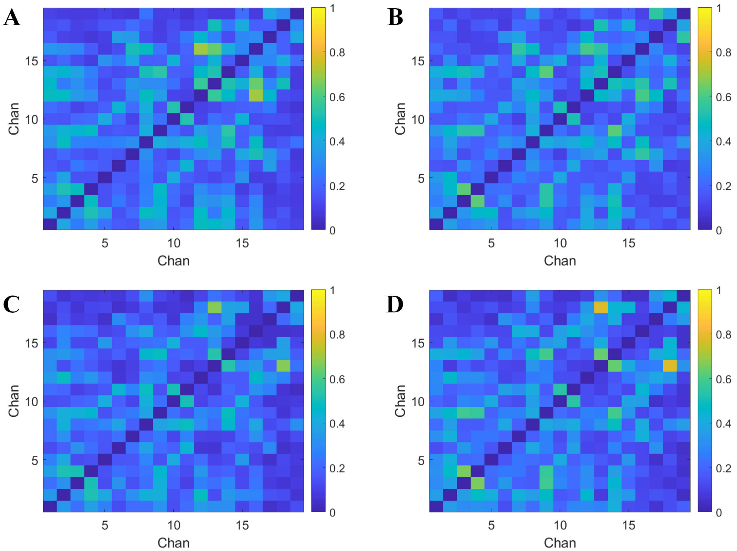 Average PLV matrix. Each row and column of the matrix represents 19 channels. (A,B) Show the microstate A segments extracted from the EEG, while (C,D) represent the microstate C segments extracted from the EEG. (A) Microstate A - healthy controls. (B) Microstate A - depression group. (C) Microstate C - healthy controls. (D) Microstate C - depression group. Chan, channels.