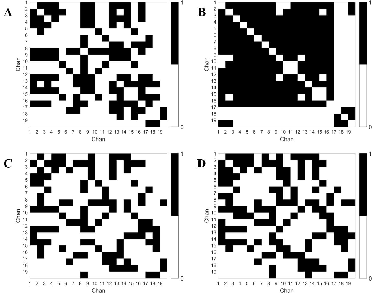 Binary matrix. Each row and column of the matrix represents 19 channels. (A,B) Show the microstate A segments extracted from the EEG, while (C,D) represent the microstate C segments extracted from the EEG. (A) Microstate A - healthy controls. (B) Microstate A - depression group. (C) Microstate C - healthy controls. (D) Microstate C - depression group.
