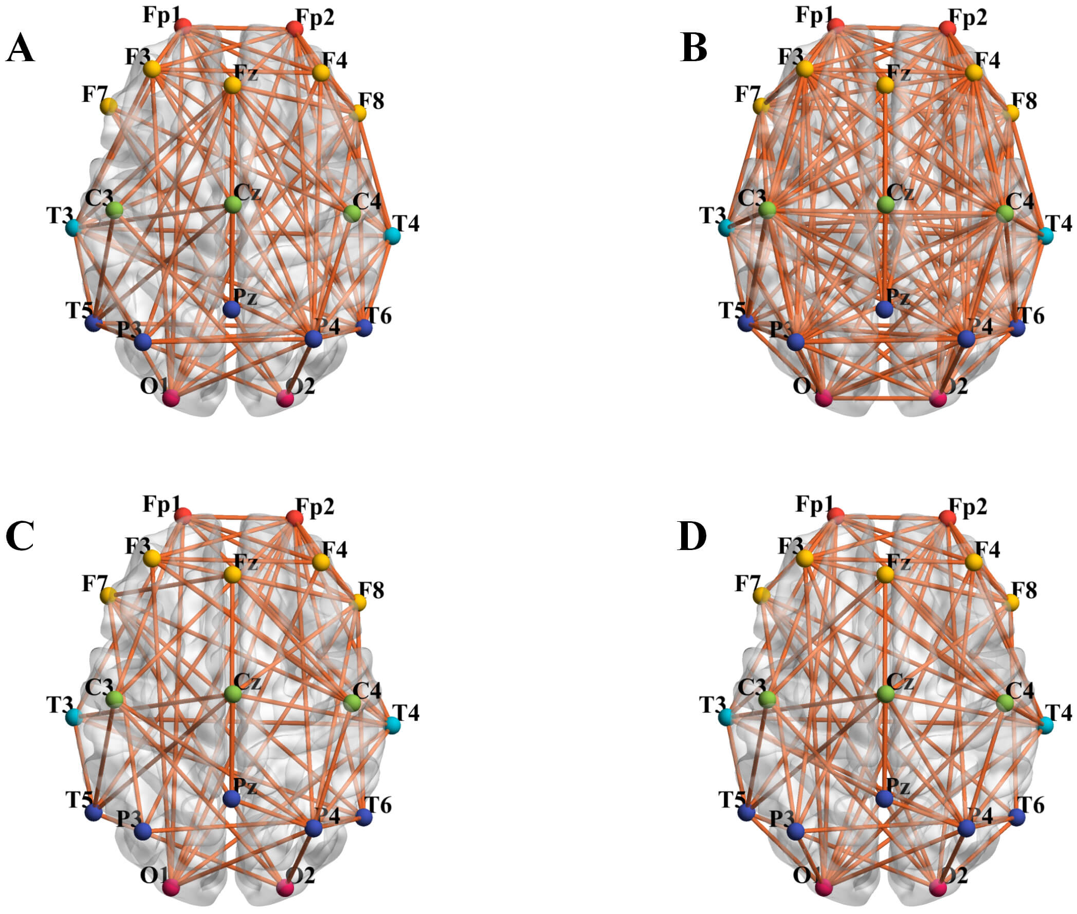 Brain network connectivity diagram. Figures (A) and (B) show the microstate A segments extracted from the EEG, while (C) and (D) represent the microstate C segments extracted from the EEG. (A) Microstate A - healthy controls. (B) Microstate A - depression group. (C) Microstate C - healthy controls. (D) Microstate C - depression group.