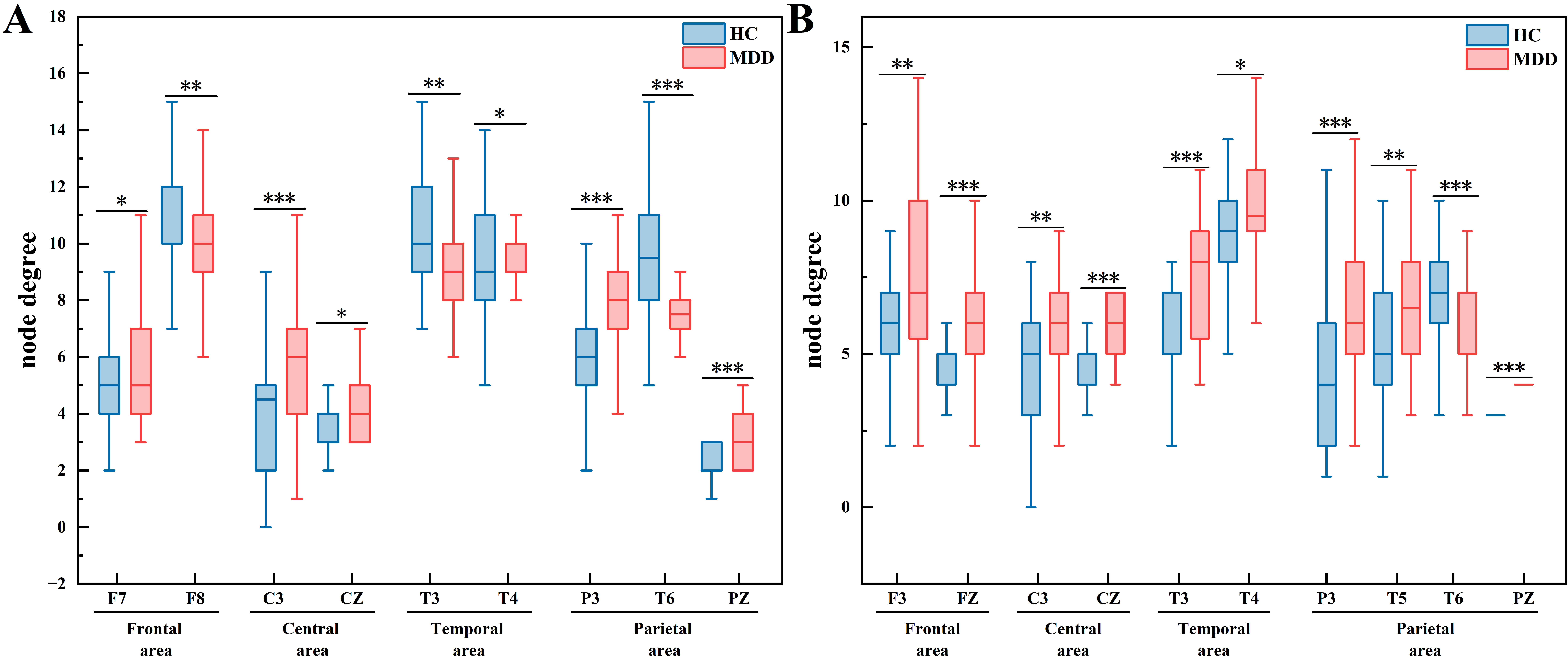 Node degree. (A) Microstate A. (B) Microstate C. * indicates