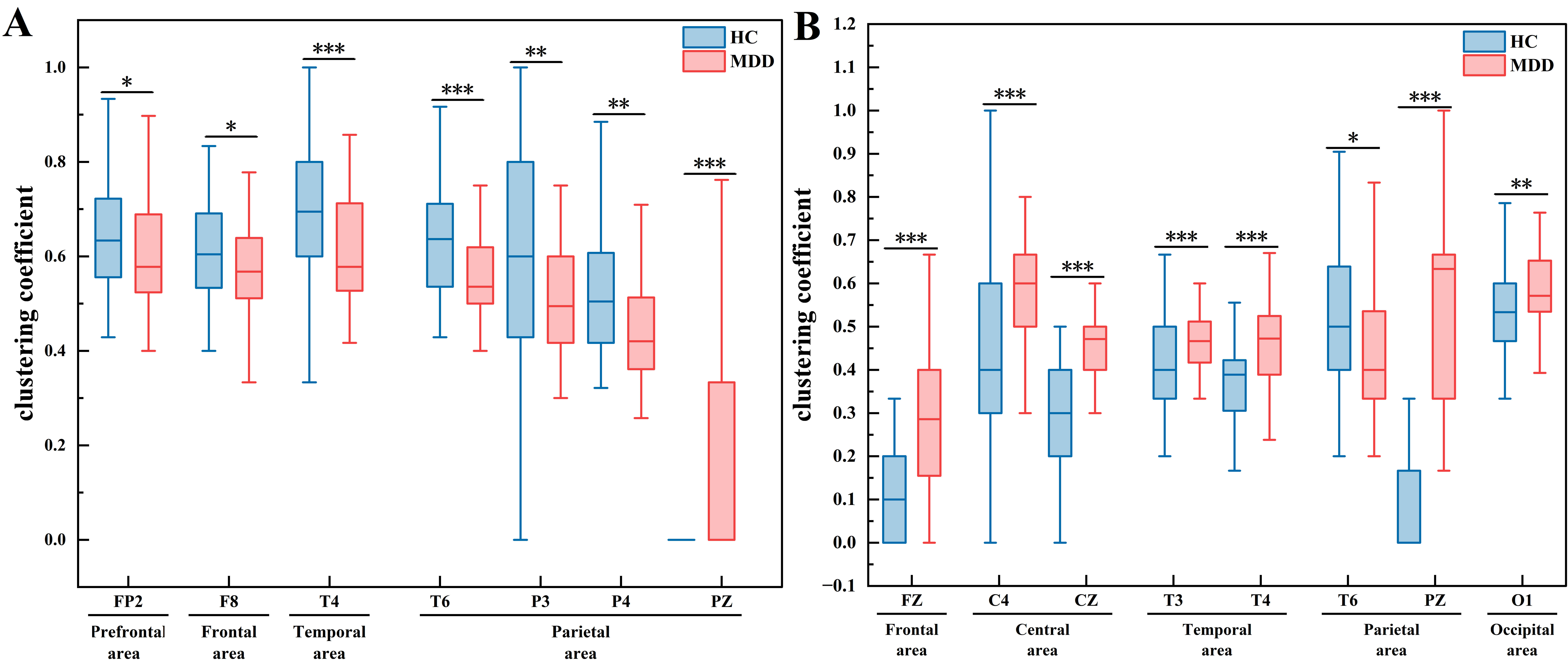 Clustering coefficient. (A) Microstate A. (B) Microstate C. *