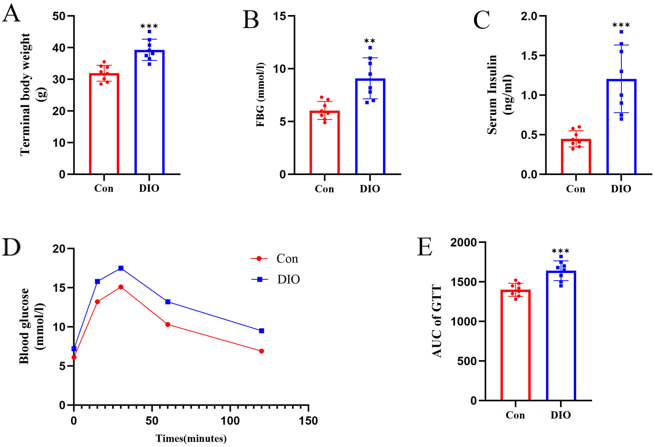 To comprehensively evaluate the systemic metabolic phenotype of DIO mice, their body weight was monitored throughout the 27-week study period. Following the behavioral tests, mice were fasted for 6 h, after which fasting blood glucose was measured from the tail vein using an Elite Glucometer (Bayer, Mishawaka, IN, USA). Serum was also collected via retro-orbital bleeding for the quantification of fasting insulin levels using a mouse-specific enzyme-linked immunosorbent assay (ELISA) kit (JL48252, JONLNBIO, Shanghai, China). A glucose tolerance test (GTT) was then conducted by intraperitoneal injection of a glucose solution (2 g/kg body weight) into mice that had fasted for 6 hours. Blood glucose levels were monitored at 0, 15, 30, 60, 90, and 120 minutes post-injection. Total glycemic excursion was quantified as the area under the curve (AUC) using the trapezoidal rule.